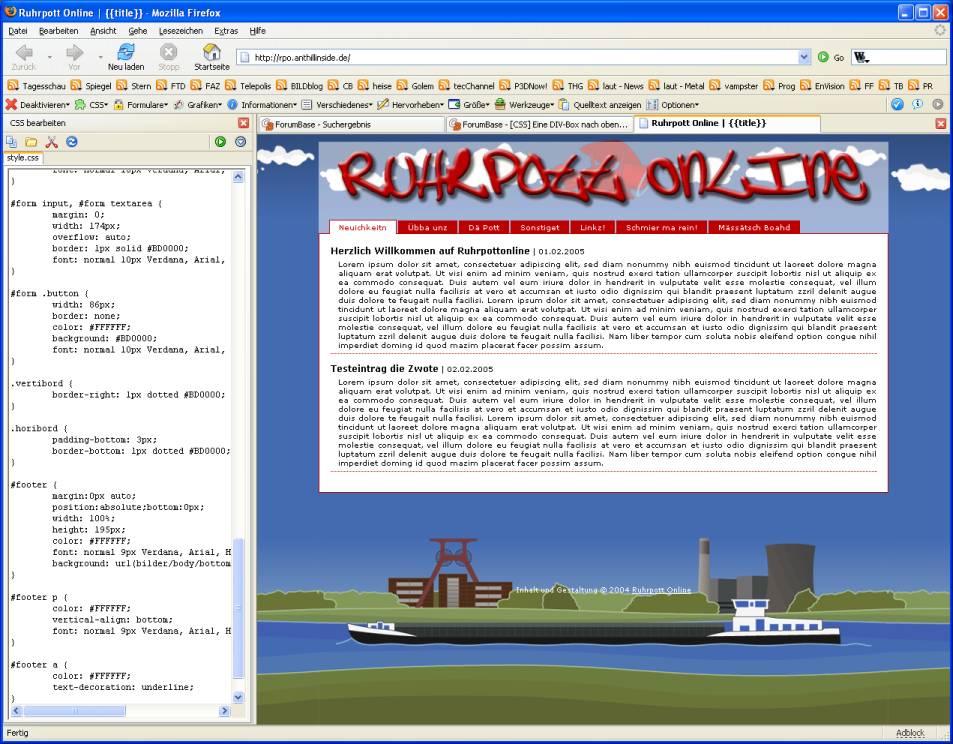 Die Box, die den Footer enthält (Bild mit dem Schiff sowie die Copyrights) soll immer unten bleiben, auch wenn die darüber positionierte Content-Box die Höhre des Browserfenster nicht ausnutzt. Ebenso soll der Footertext untenbündig angezeigt werden und an beidem scheitere ich momentan. Hier der CSS-Code