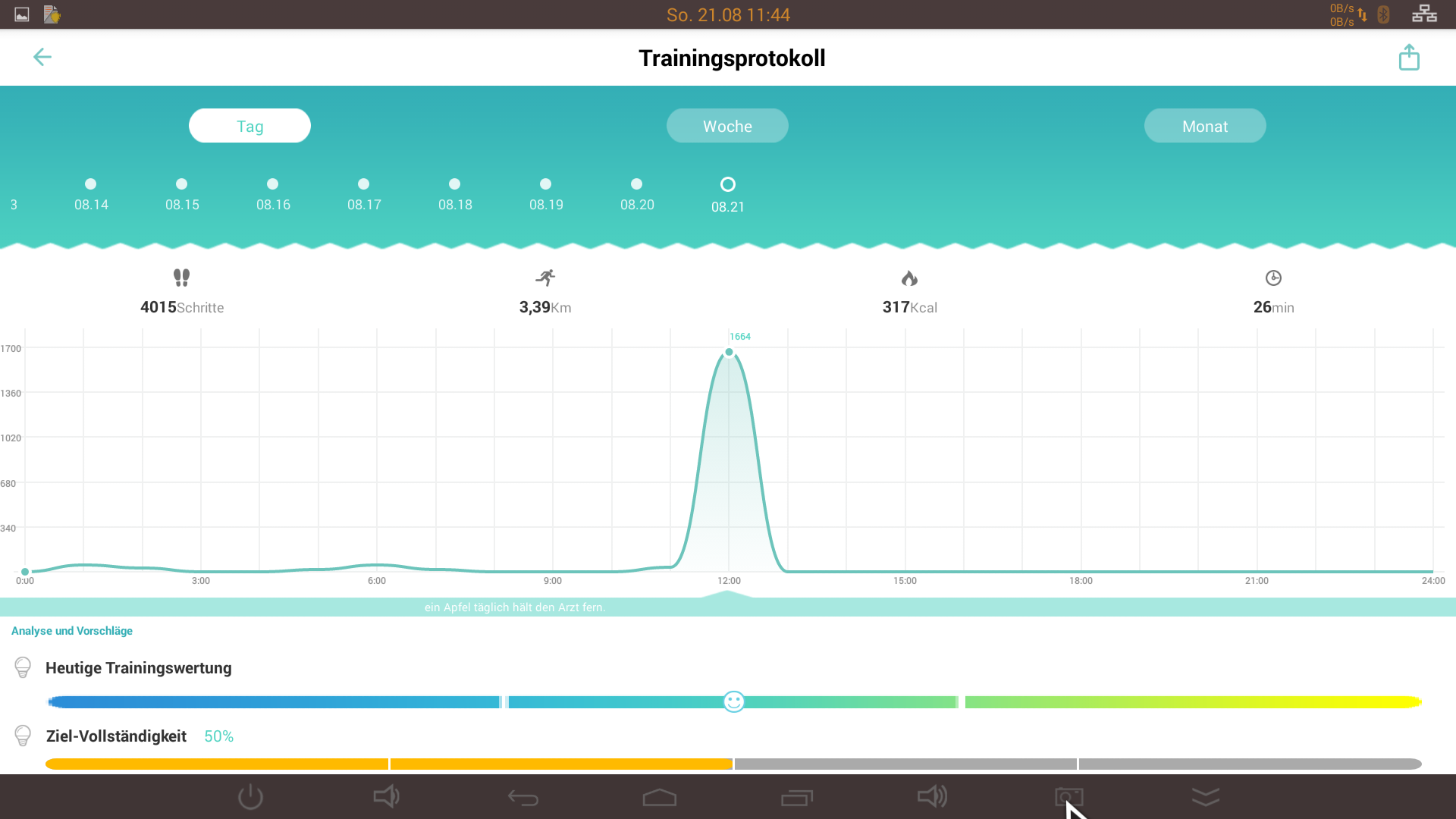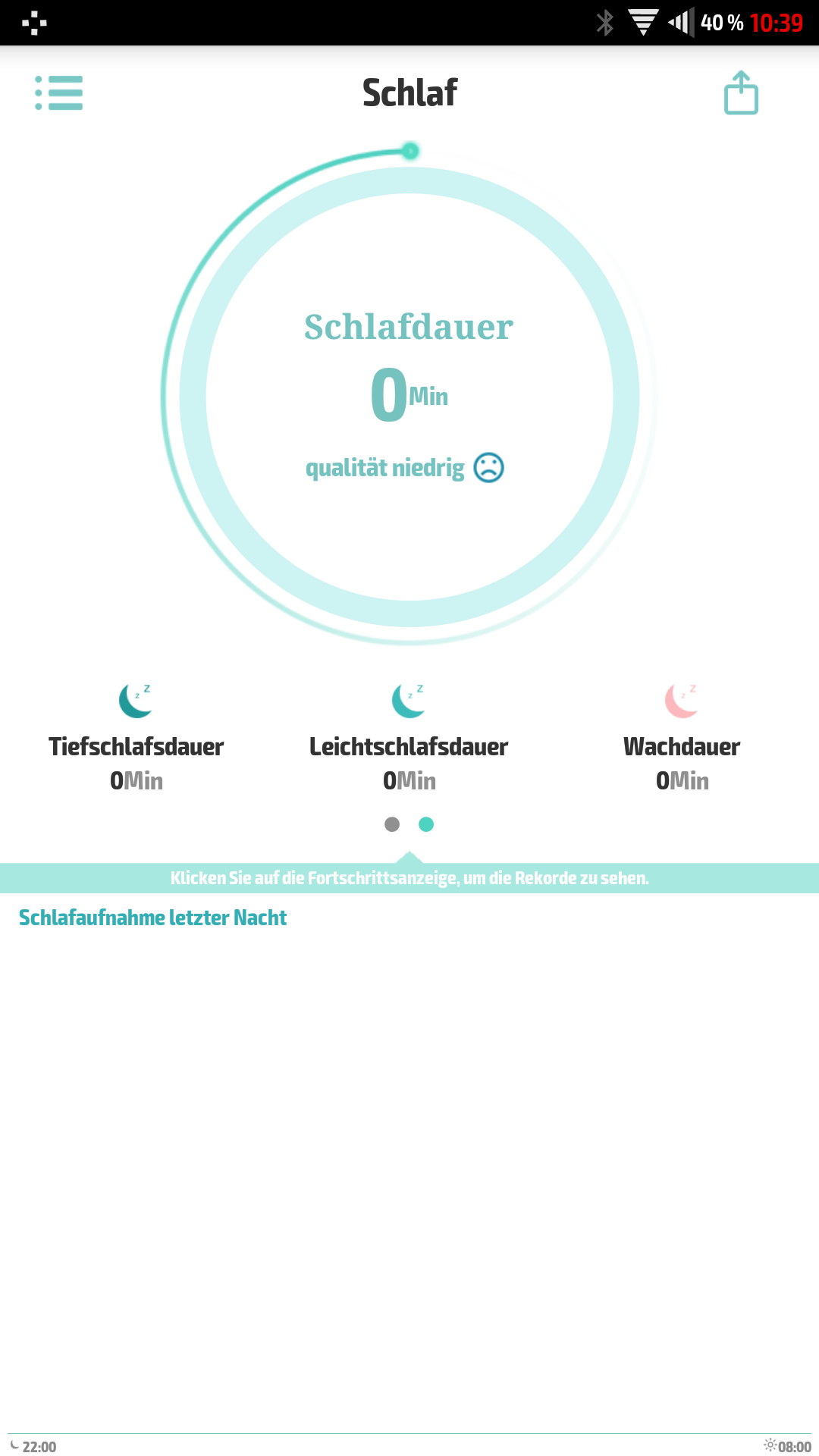 Einen Schlaftracker gibt es auch. Ich habe es jedoch bis jetzt noch nicht benutzt, deswegen denkt die App auch, das ich in den letzten Tagen nicht eine Sekunde geschlafen habe