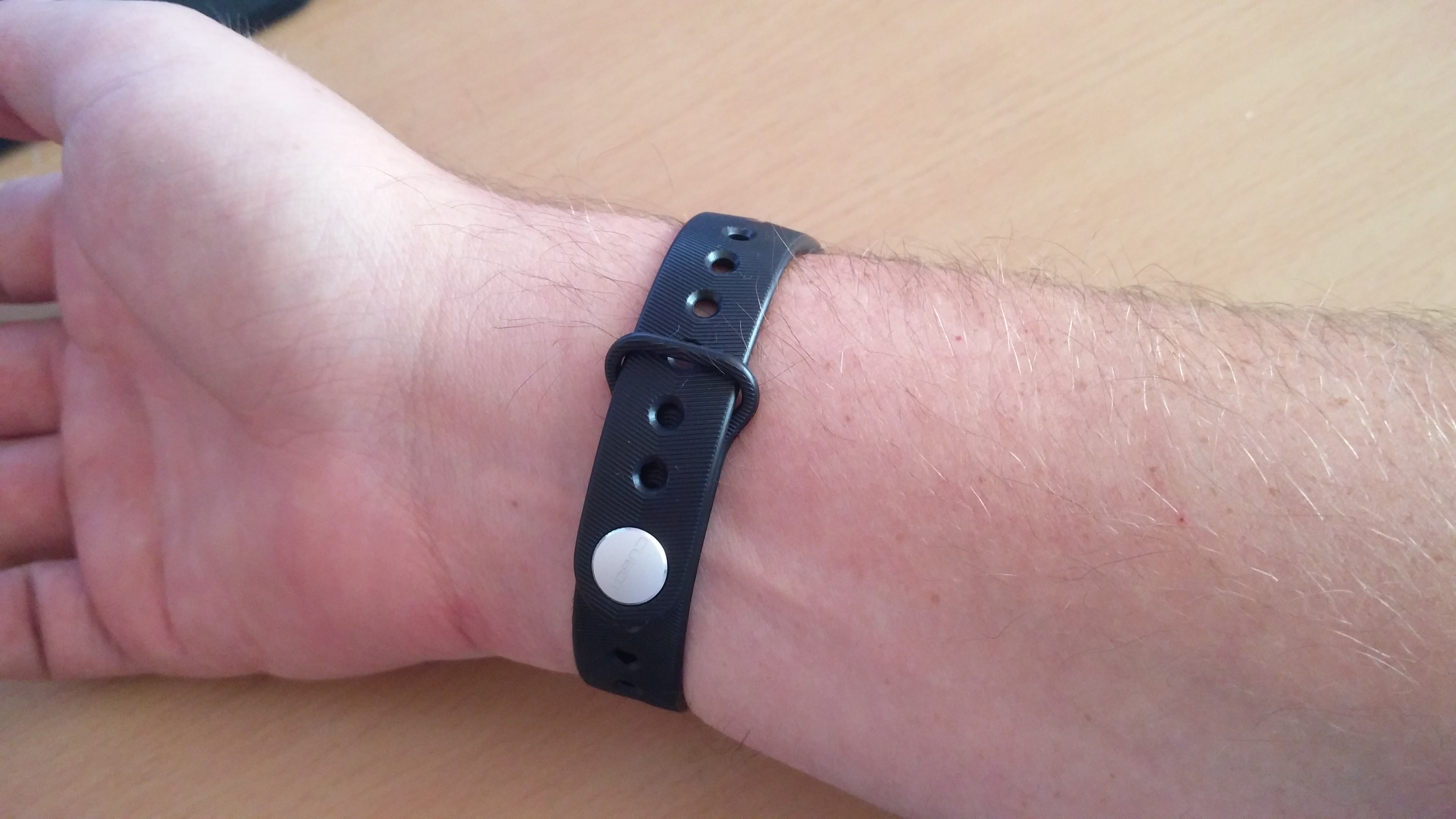 Das Silberne Cubot-Logo ist gleichzeitig der Verschlussmechanissmus. Dahinter verbirgt sich ein TPU-Knubbel, der wunderbar in die Löcher einrastet. Das Band V1 sitzt zu 100% fest und sicher am Handgelenk. Kein versehendliches öffnen und auch provoziertes öffnen durch spannende Bewegungen des Handgelenkes, des Armes und der Hand machen dem Fitnessband nichts aus.