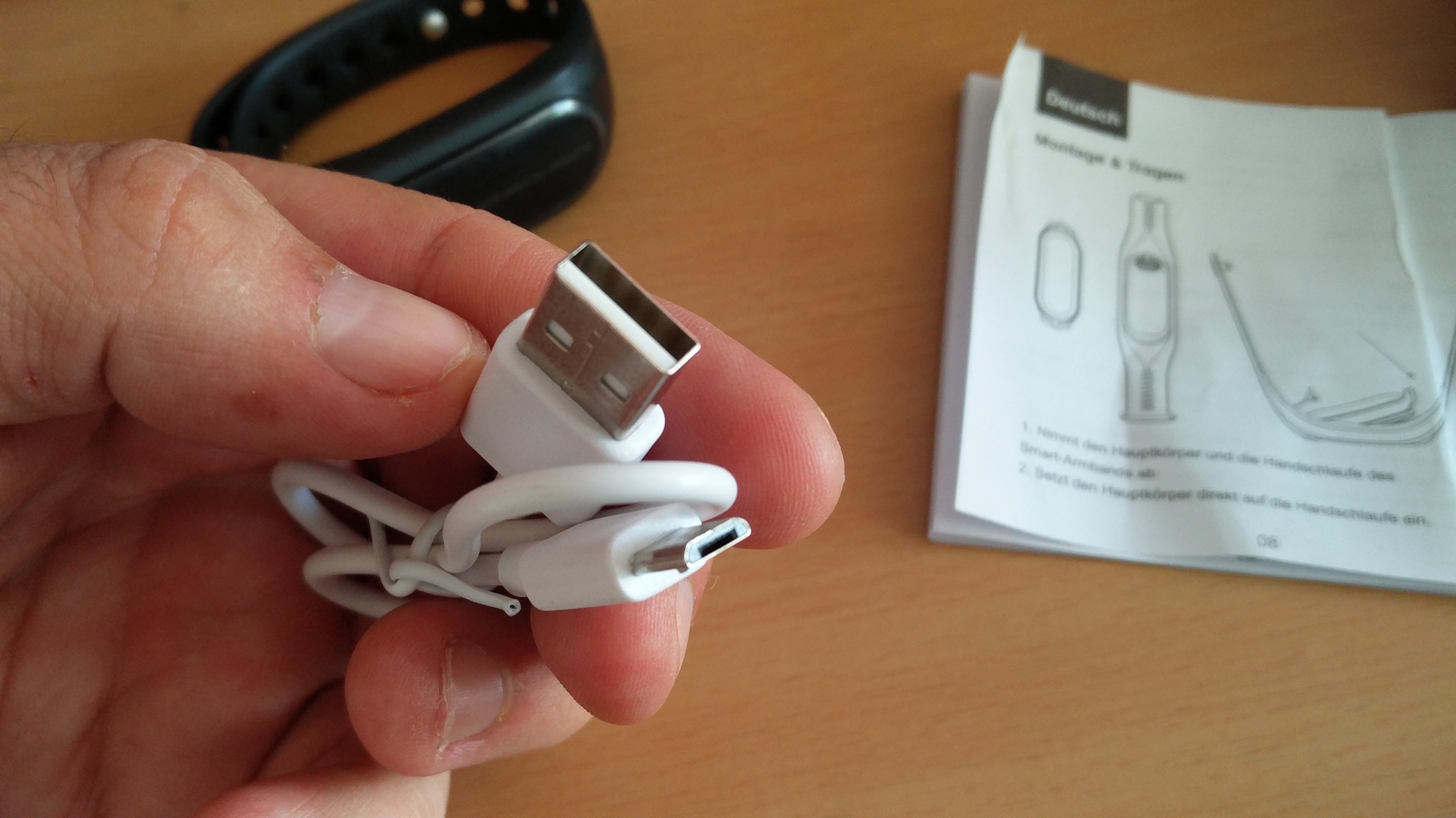 Als Zubehör wird ein Micro-USB-Kabel mitgeliefert. Dieses Kabel ist wirklich sehr kurz. Vielleicht 10cm lang. Nicht länger. Als ich das Cubot Band V1 mit zwei von meinen eigenen USB-Kabeln laden wollte, passierte nichts. Dieses Kabel hier ist beim Anschluss etwas länger, mit dem Kabel funktioniert das Laden problemlos.