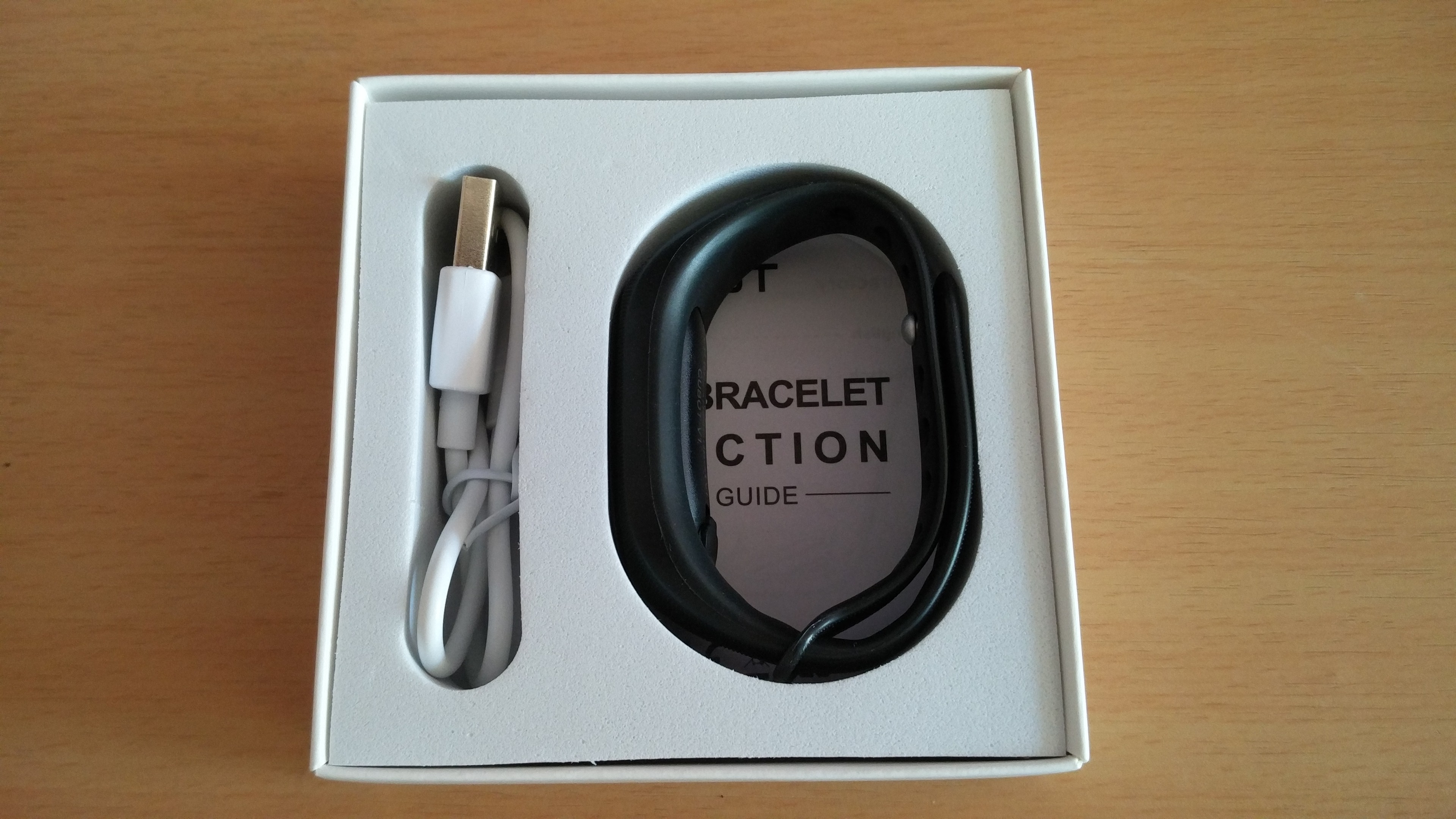 Schon interessanter oder ? Und so sieht das ganze aus, wenn man den Karton öffnet. Man sieht auf der rechten Seite das Smartband und auf der linken Seite das USB-Kabel. Darunter befindet sich die Beschreibung. Mehr findet man nicht.