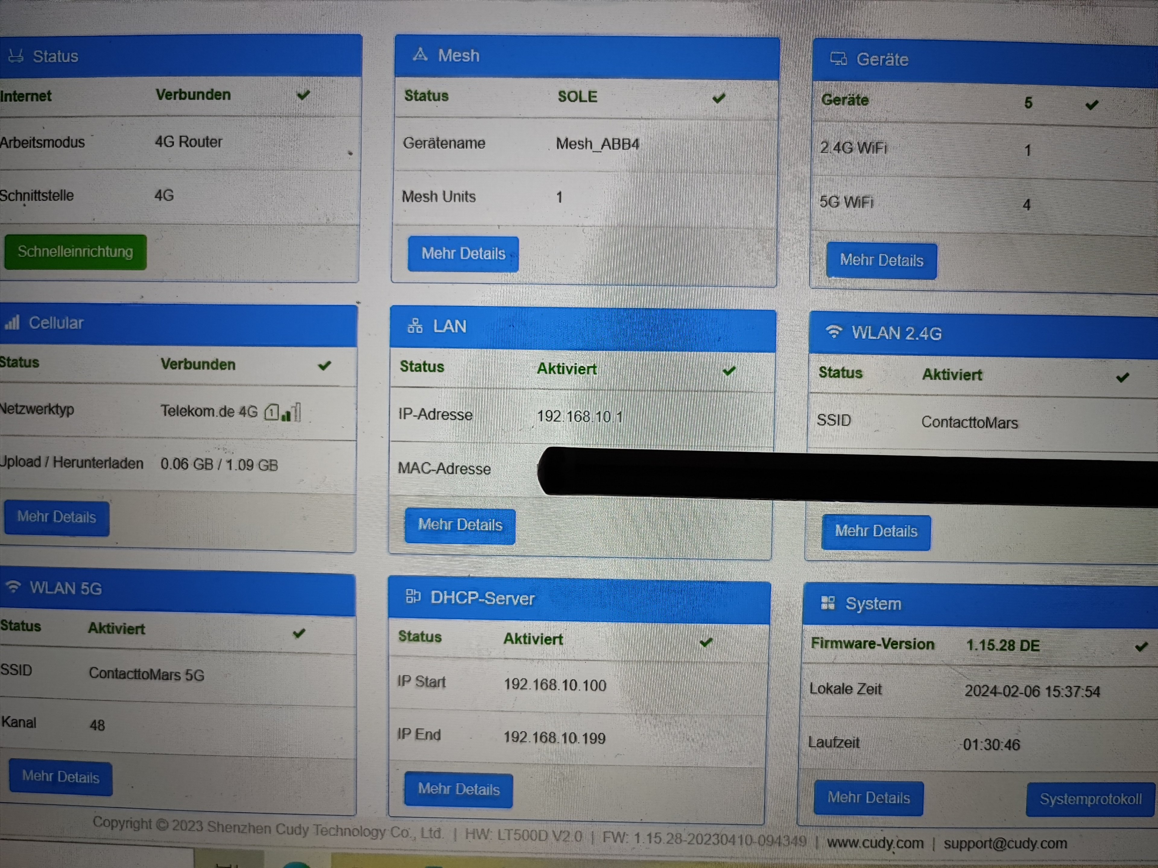 Moin. Es geht um einen Cudy LT 500D über Datensim Telekom . Hab folgendes Problem. Über WLAN habe ich eine Saubere Internet Verbindung. Nun wollte ich die LAN Leitung nutzen da bei Bauarbeiten unsere DSL Leitung gekappt worden ist und ich quasi damit an meine 7590 zur Überbrückung an WAN anschließen möchte . Nur habe ich über LAN keine Internet Verbindung seitens Cudy Router. "LAN"(192.168.10.1, 255.255.255.0) und der "LAN Hafen" ist im Menü ausgewählt. Laut Laptop wird die Verbindung auch erkannt,kann auf das Router Menü zugreifen,hab aber halt keine Internet Verbindung. Hab ich da was übersehen von den Einstellungen her?