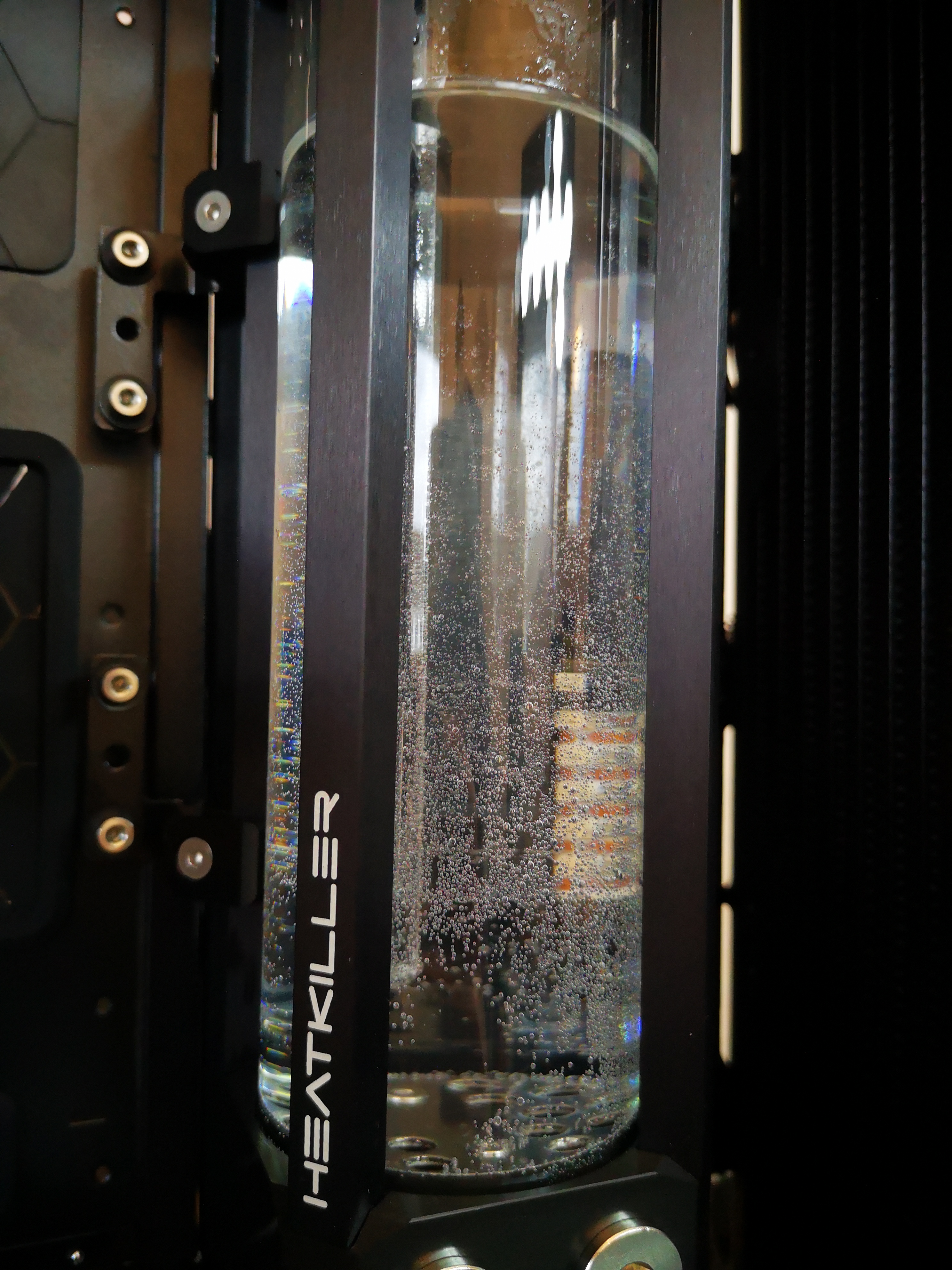 Mein Heatkiller Tube hat 2 "Tubes" drin, einmal für den CPU OUT und einmal fürs nachfüllen. Eigentlich habe ich mir schon gedacht dass das Tube zum Einfüllen nicht nur überflüssig ist, sondern mit das Einfüllen schwer macht, physikalisch bedingt (Wasserstand). Und genau so kam es auch. Ich konnte kaum 60ml Flüssigkeit nachfüllen bis nichts mehr ging, die Pumpe für 1 Sekunde anwerfen und von vorne.... ne...