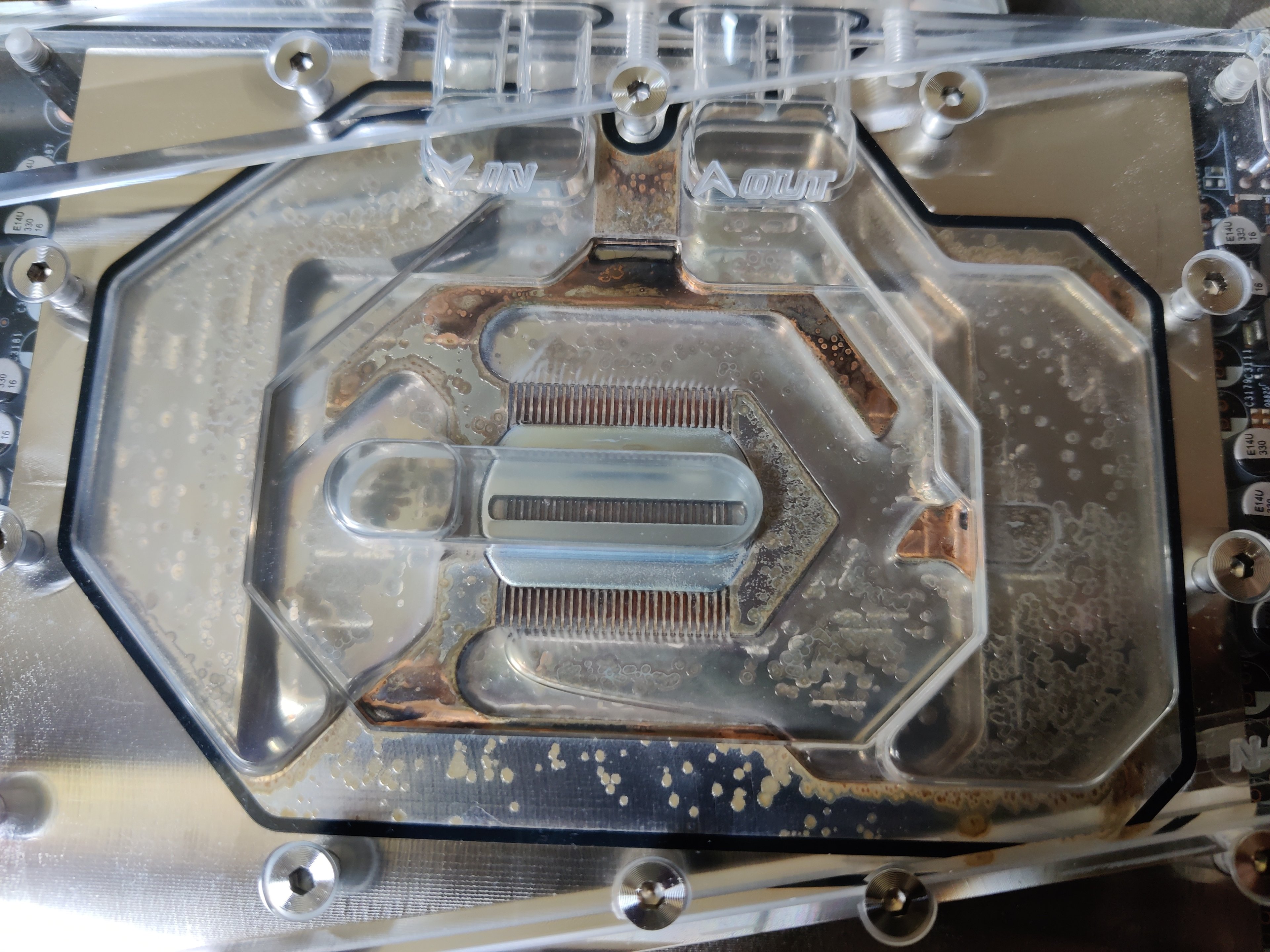 Der Bykski Wasserblock für die Zotac 4090 Trinity hat fleißig gearbeitet, die Nickelschicht in Teilen runter und großflächig angegriffen.
