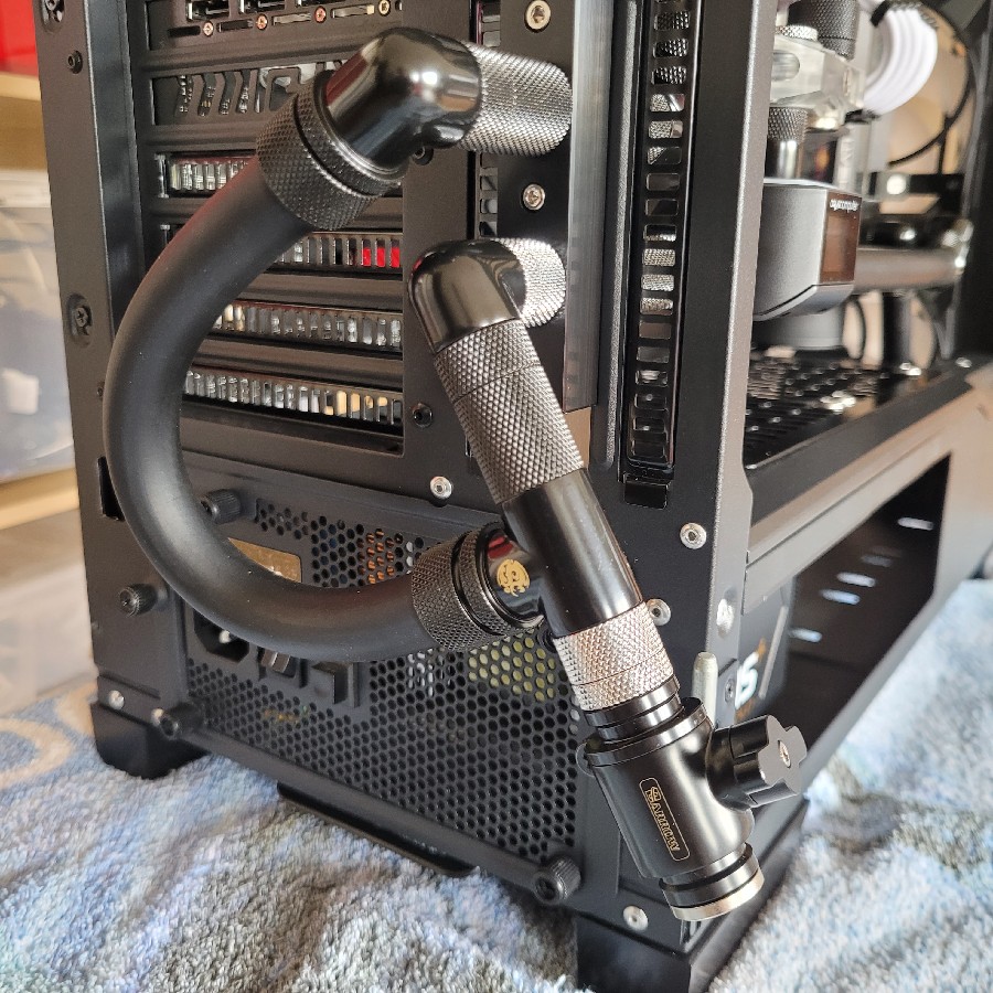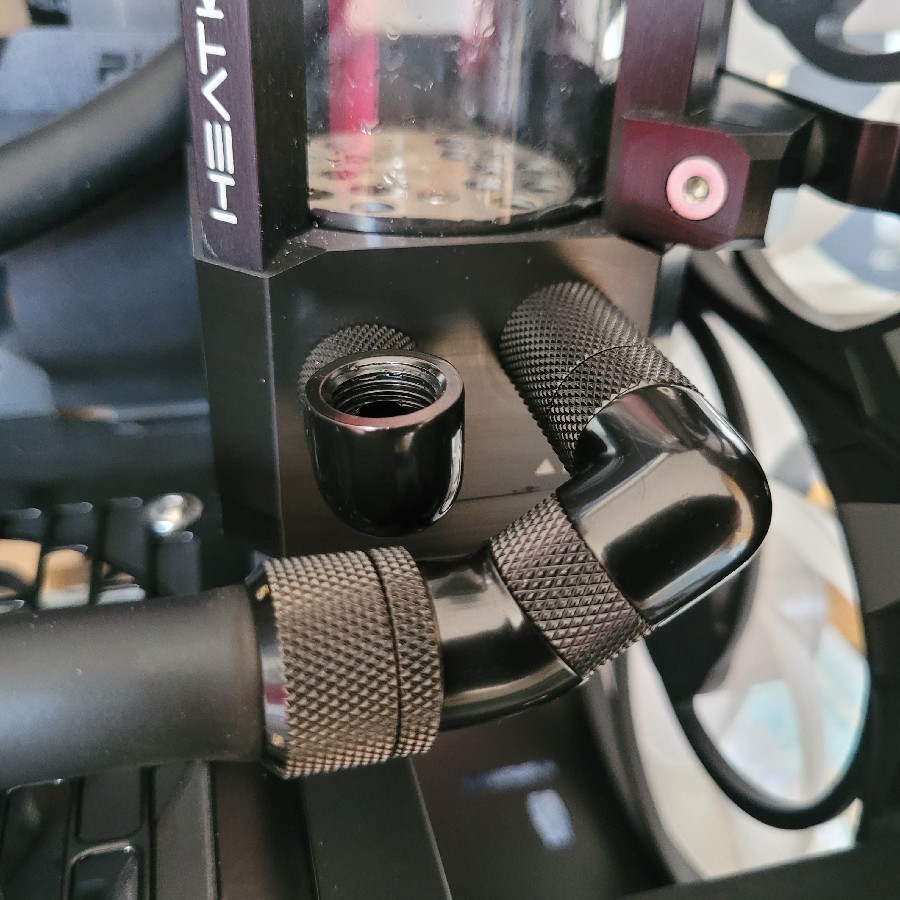 Die Pumpe läuft an, die Flüssigkeit sucht sich ihren Weg und aus dem Pumpeneingang kommt langsam die Luft raus. Ich fülle langsam weiteres DP Ultra nach, als sich der Radiator quasi aus dem Nichts verschluckt und anfängt zu husten 😅 und mir dabei die ganze Rotze ins Gehäuse kotzt 🤣.