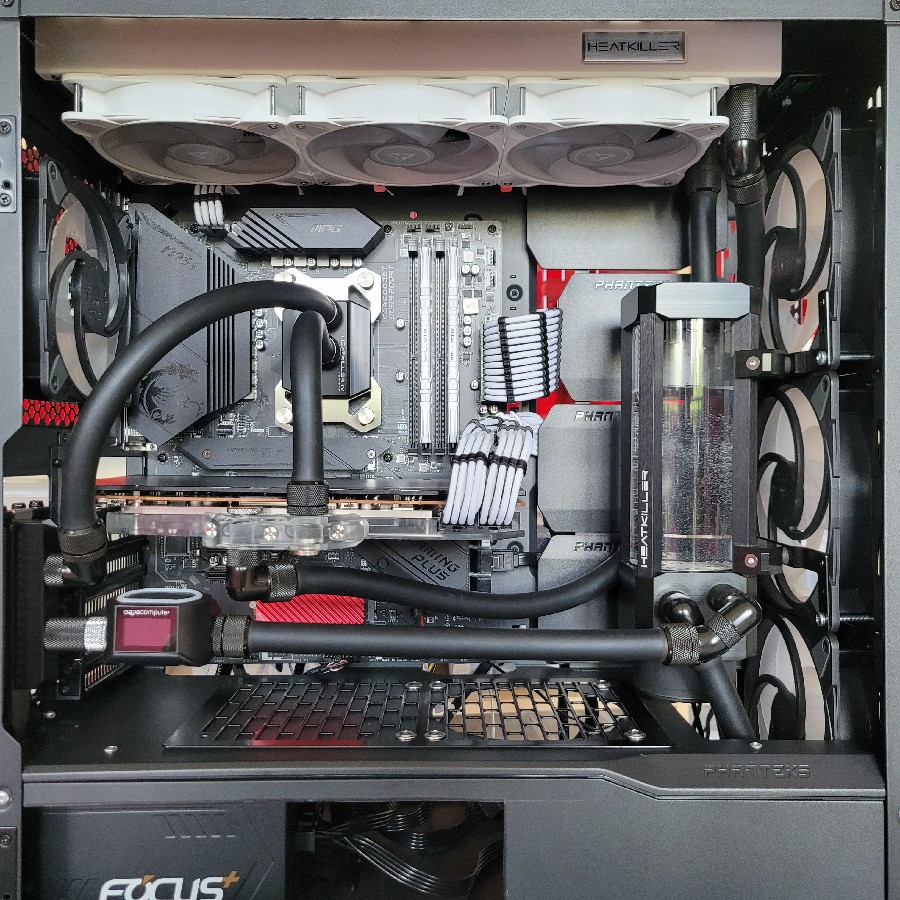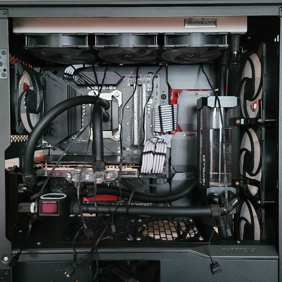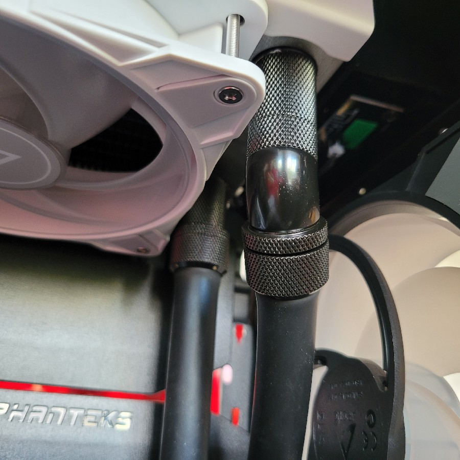 Die Lüfter habe ich gedreht montiert, so dass diese die Luft von hinten nach vorne durch den Radiator ziehen.