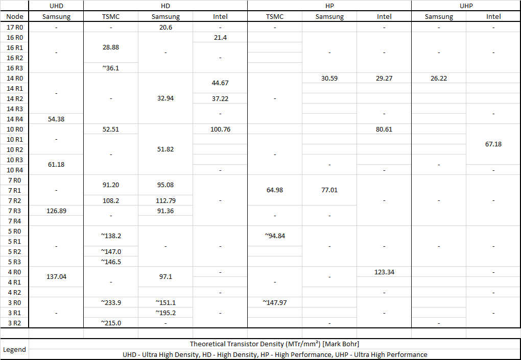 Die Transistordichte ist etwas komplexer, hier wird eine Metrik von Intel verwendet die verschiedene Zellen umfasst. Nämlich zu 40 % NAND Gatter und zu 60 % Scanned Flip Flops.