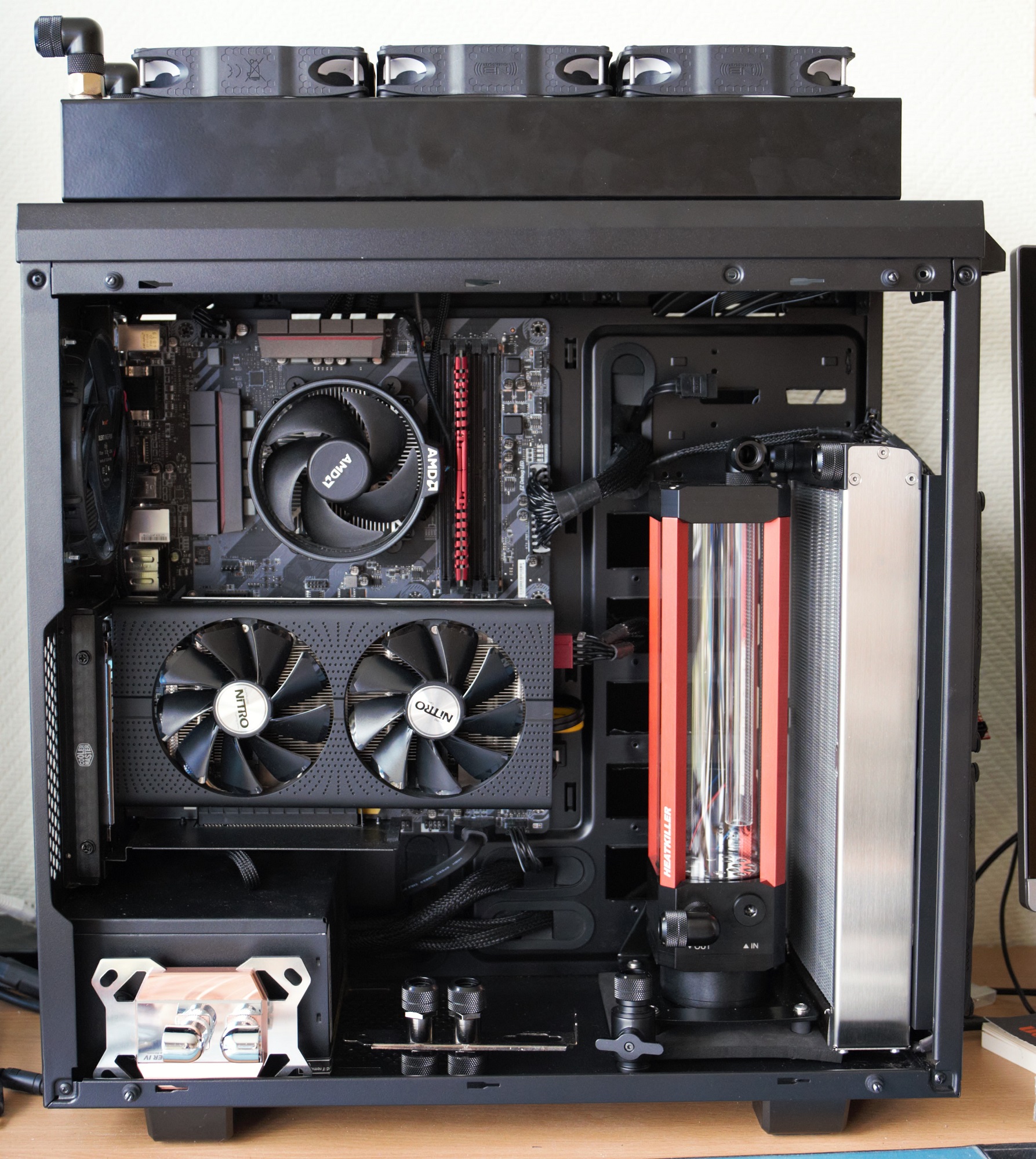 Ich habe die letzten zwei Wochenenden die Komponenten eingebaut und dabei festgestellt, dass doch einiges nicht ganz so einfach ist wie gedacht. Der Frontradiator im Pure Base 600 darf nur 40mm dick sein, wenn man 120er-Radiatoren verwendet, sonst stößt der Radiator innen an die Halterungen der HDD-Käfige. Da fehlen nur 2mm, deswegen habe ich meine jetzt weggebogen. Wer es perfekt haben will, nimmt Radiatoren die entweder 280x30 oder 240x40 groß sind. Ohne ODD-Käfig gehen natürlich auch größere.