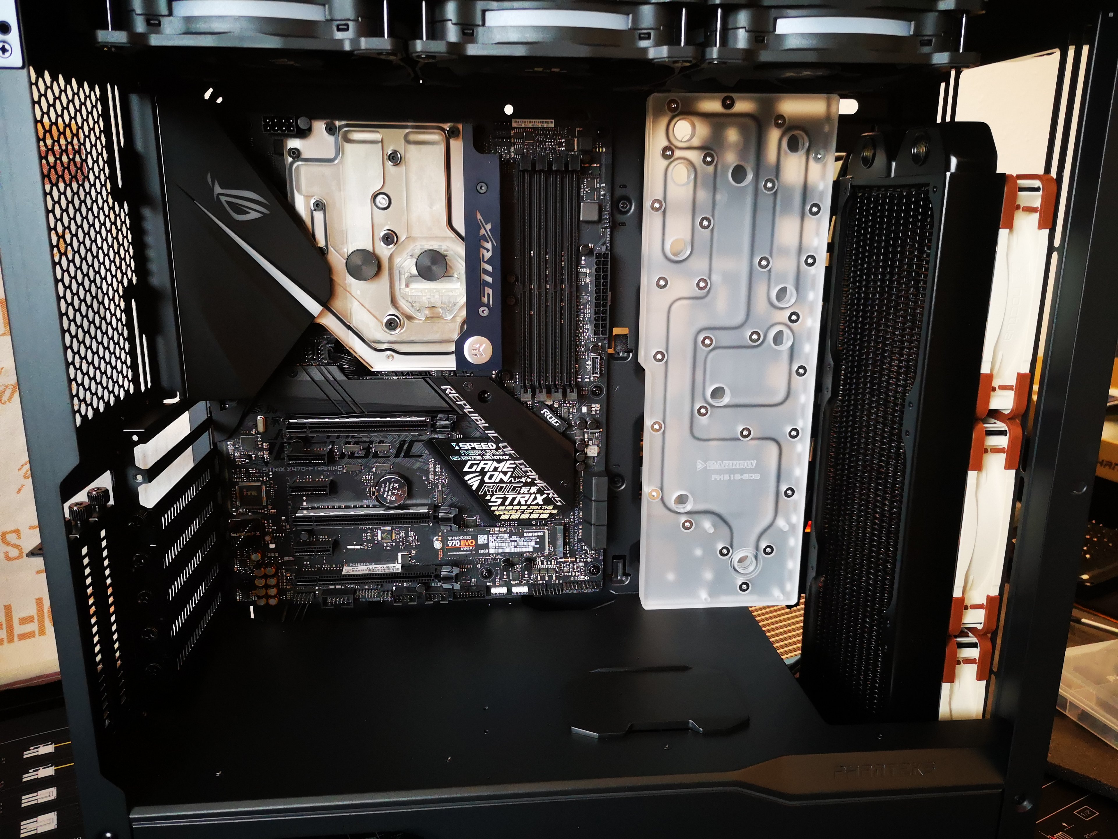 Leider leider leider hat mich das Resultat am Ende optisch nicht umgehauen, da ich als absoluter Laie zu wenig vorgeplant habe. Die Temperaturen waren super, Cinebench R15 von 84° (AiO) auf 46 - 49° (CL) gesenkt, GPU entsprechend auch von ca. 75° auf unter 50°.