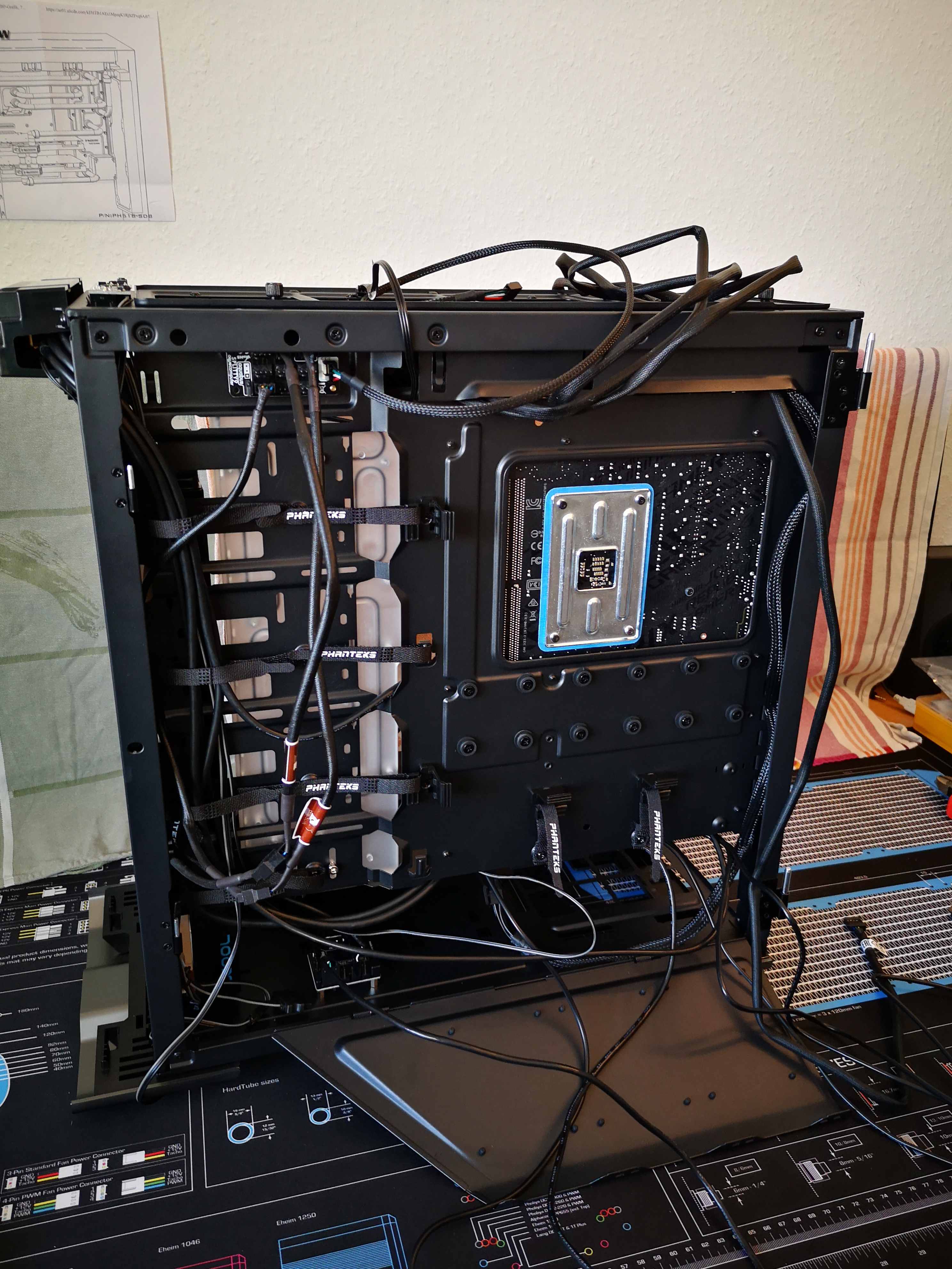 Es sind diesmal unglaublich viele Kabel zu verlegen. Die Riing Fans haben je Fan einen dicken USB Kabel = 4 dieser Kabel nur für die Fans. Dazu die ganzen Aquacomputer Hardware die mit dem Board und untereinander verbunden wird usw. usw. usw... jaja ist eine Herausforderung die ich gerne annehme^^