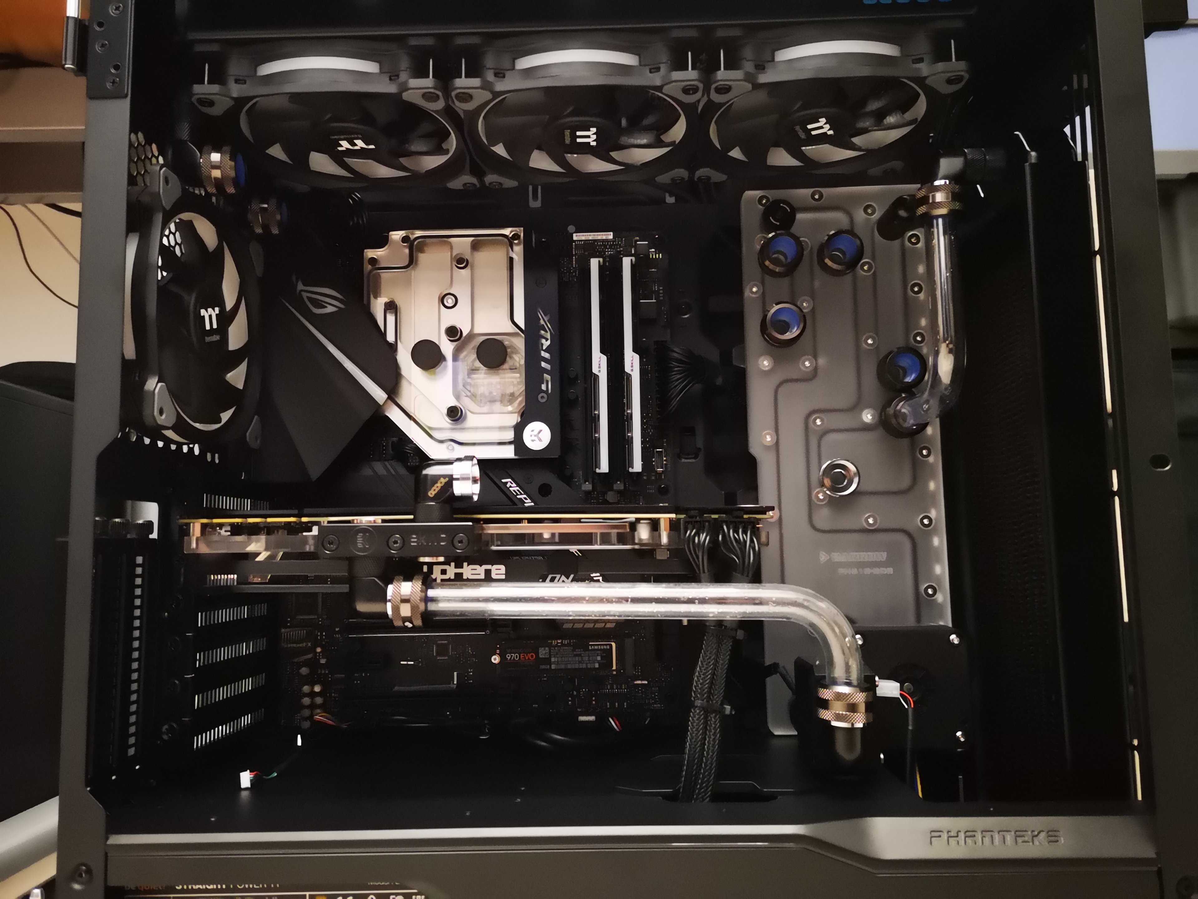 Gleich nach der Pumpe kommt ein 90° Winkel, dann Temperatur Sensor und die Durchflusssensor, ist wohl die beste Stelle um das Teil "unsichtbar" unterzubringen. Ich denke, nächste Woche sollte ich fertig werden mit dem PC.