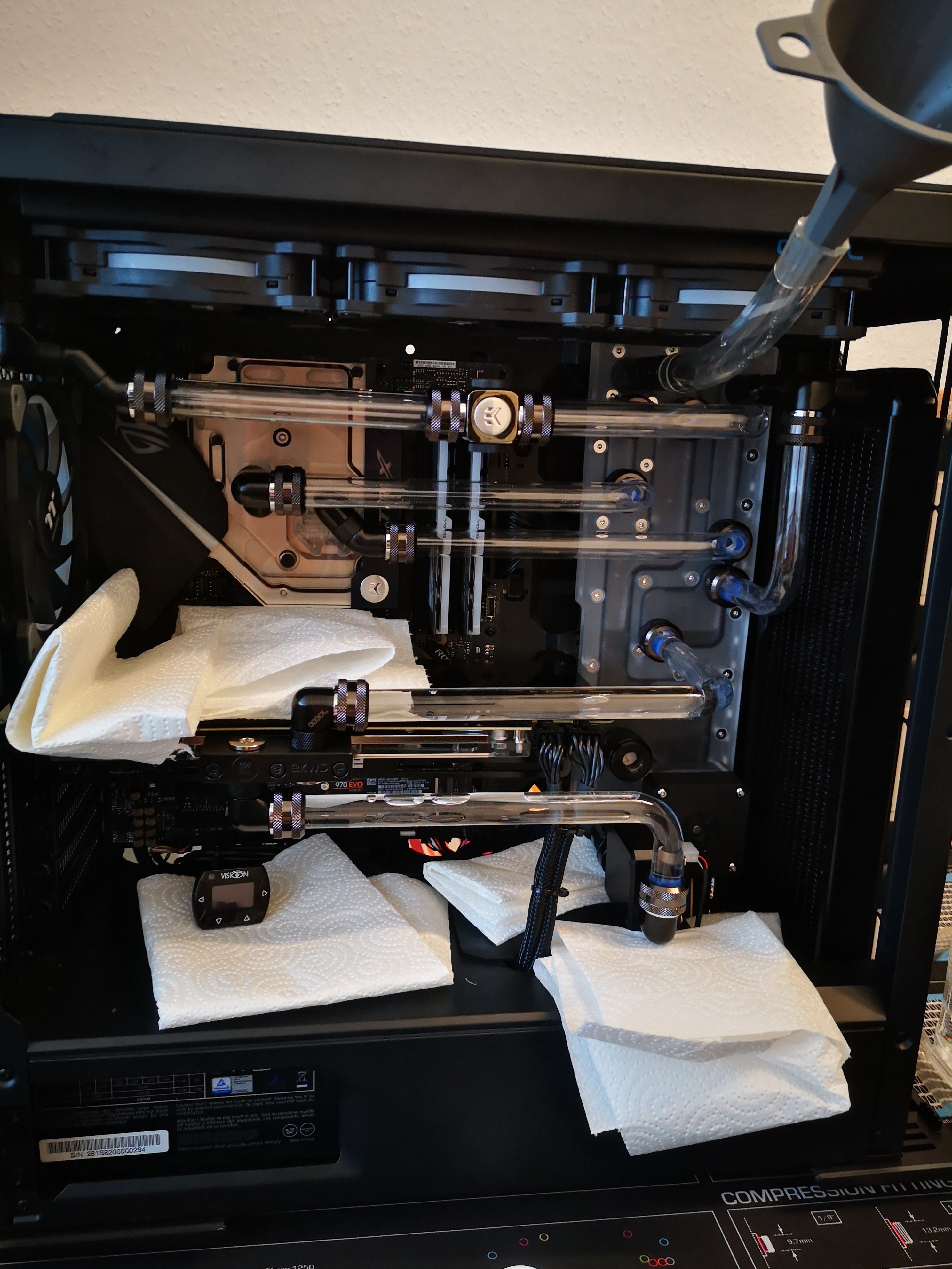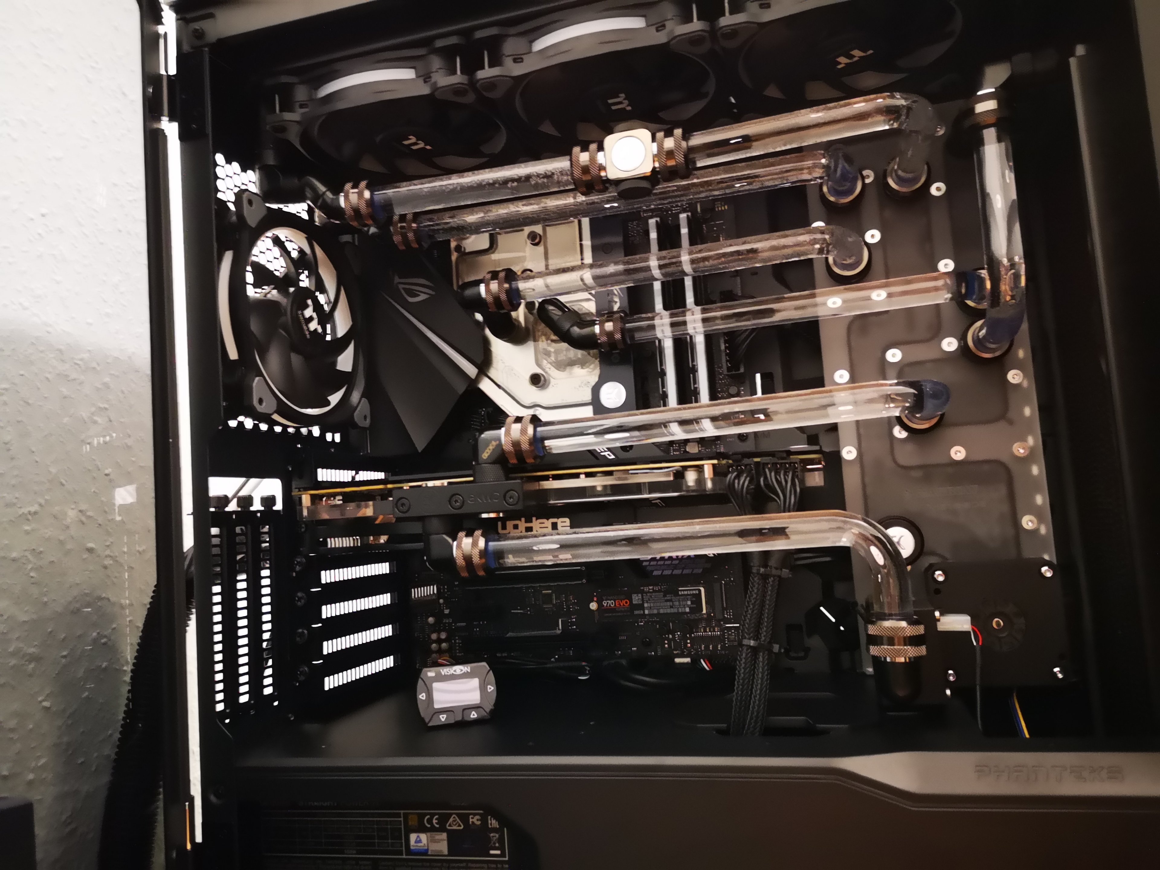 Aktuell läuft die Pumpe auf 65% bei 2892rpm und 72 Liter Durchfluss. Passt soweit, werde in den nächsten Tagen die magische Grenze zwischen Leistung und Hörbarkeit finden müssen. Zurzeit höre ich die Fans, aber nicht die Pumpe.