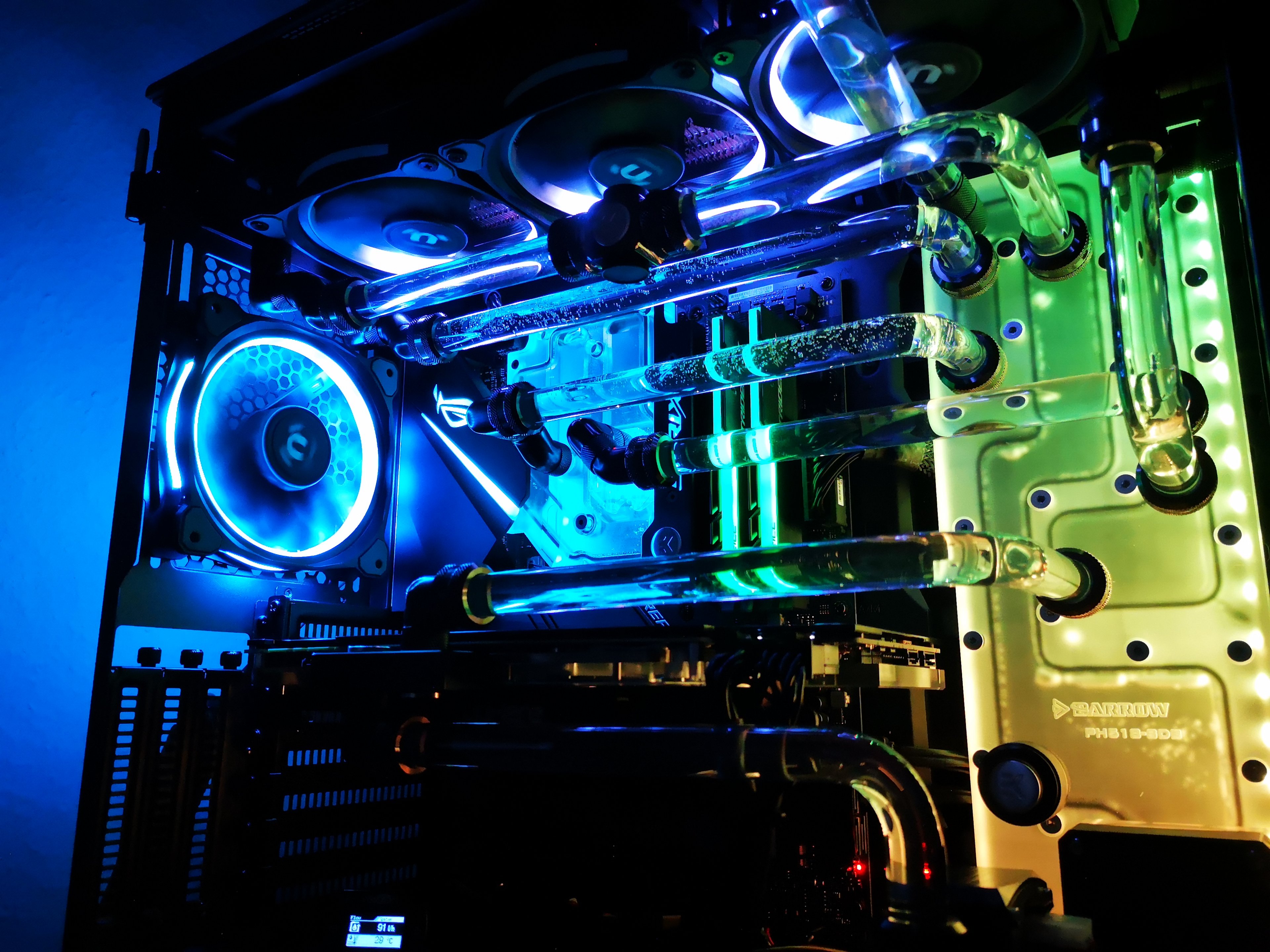 Wollte meinen am wocheende umbauen raus kam folgendes ; der selbe durchfluasmesser zeigt bei mir Fehler an Durchfluss zu gering obwohl die pumpe 12 rennt ausserdem will der PC nich mehr starten obwohl MB und alles Strom hat