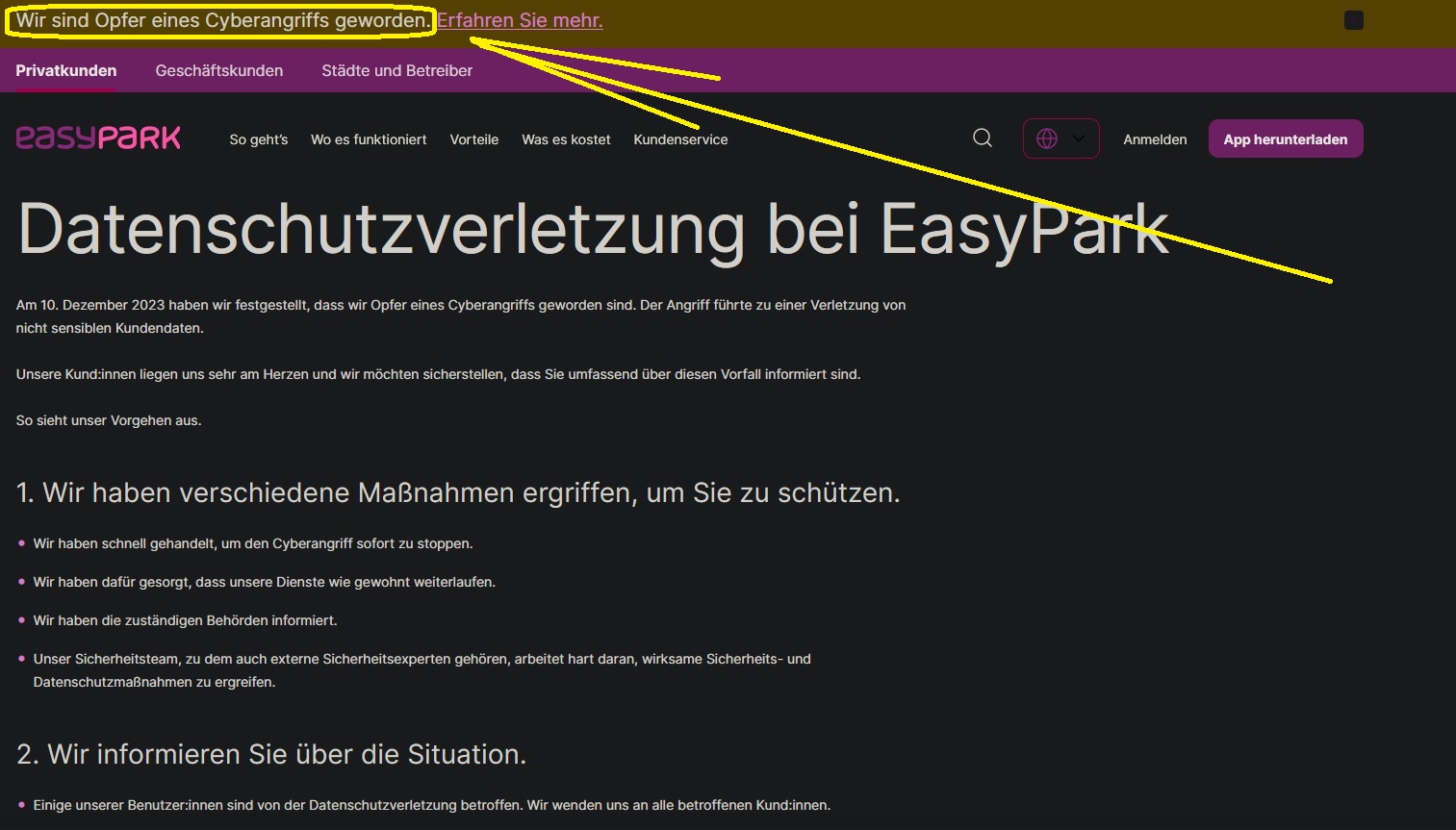 Letzten Sonntag (10. Dezember 2023)wurde easypark anscheinend "gehackt" hat easypark einen Angriff bemerkt, bei dem Daten abgegriffen wurden.