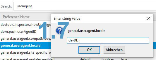 1.6.2 Doppelklick in die Zeile mit dem Preference Wert "general.useragent.locale"