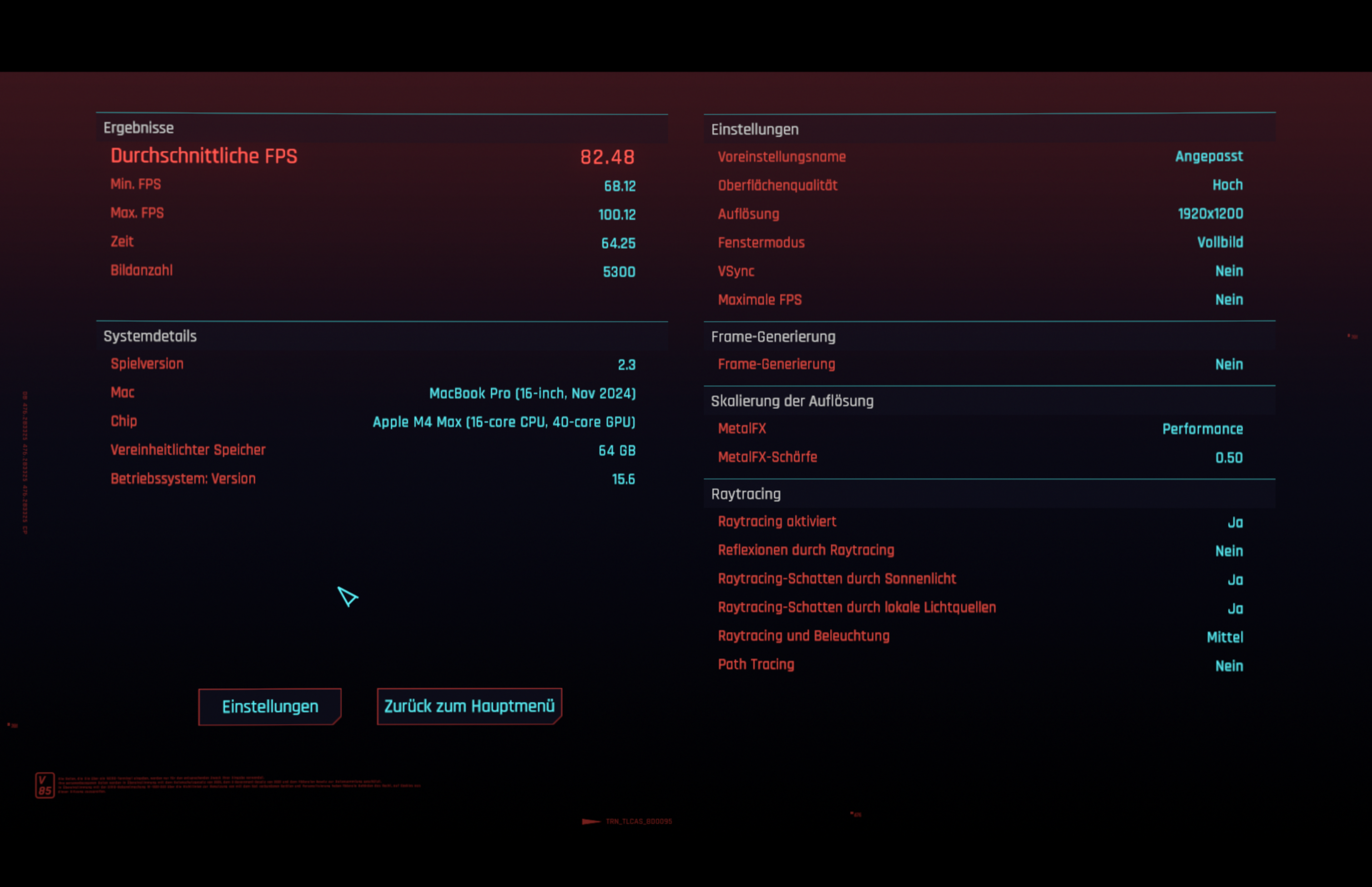 1.920 × 1.200, Preset „Raytracing: Mittel“, MetalFX „Performance“: 82,48