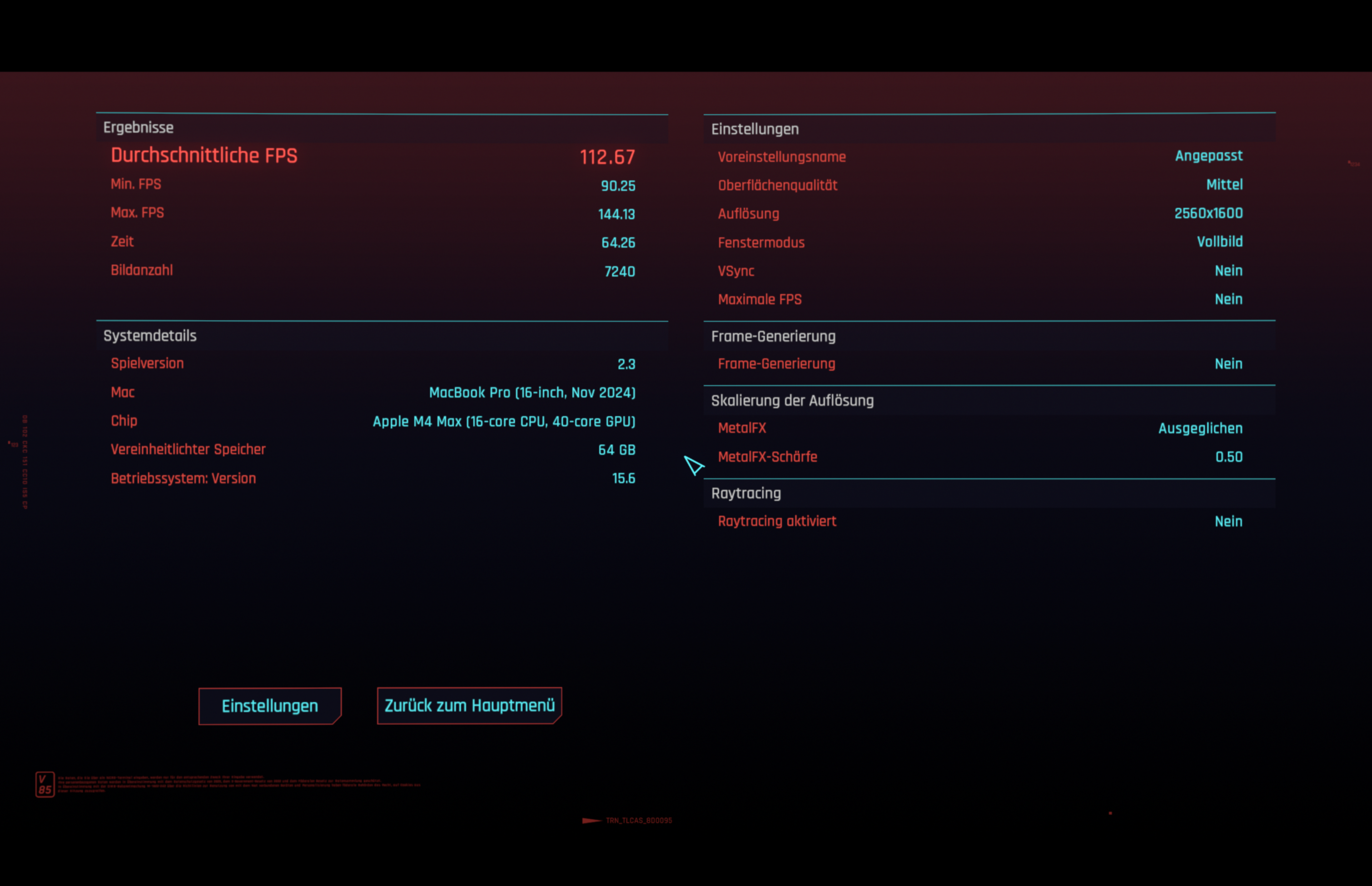 System: M4 Max Mac Studio (16cpu40gpu64GB) 2560x1444 Monitor (Full HD getestet)