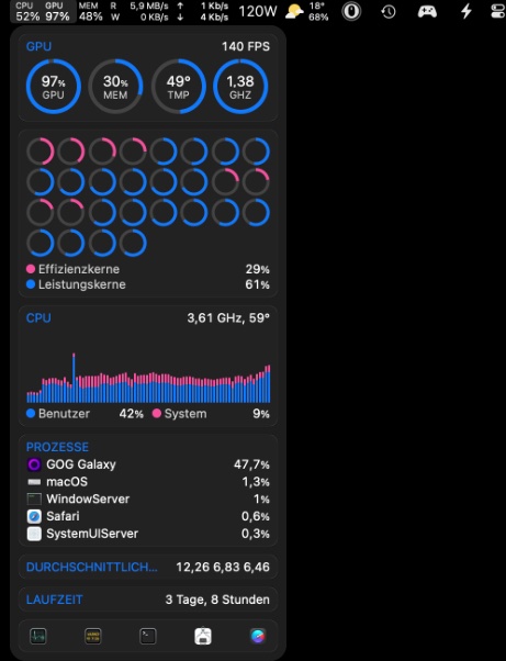 Sofern man möchte, ist dies das "CPUz + GPUz" der Mac Welt, was halt einfach immer im Hintergrund läuft und nette Daten oben in der Bar anzeigt bei Nutzung inkl. dem Nerdkram, den man halt gerne mal prüfen will wie z.B. dem GPU Verbrauch. Sowas wie Custom Lüfterkurven im ganz einfach gehaltenem Bereich sind hier auch möglich.