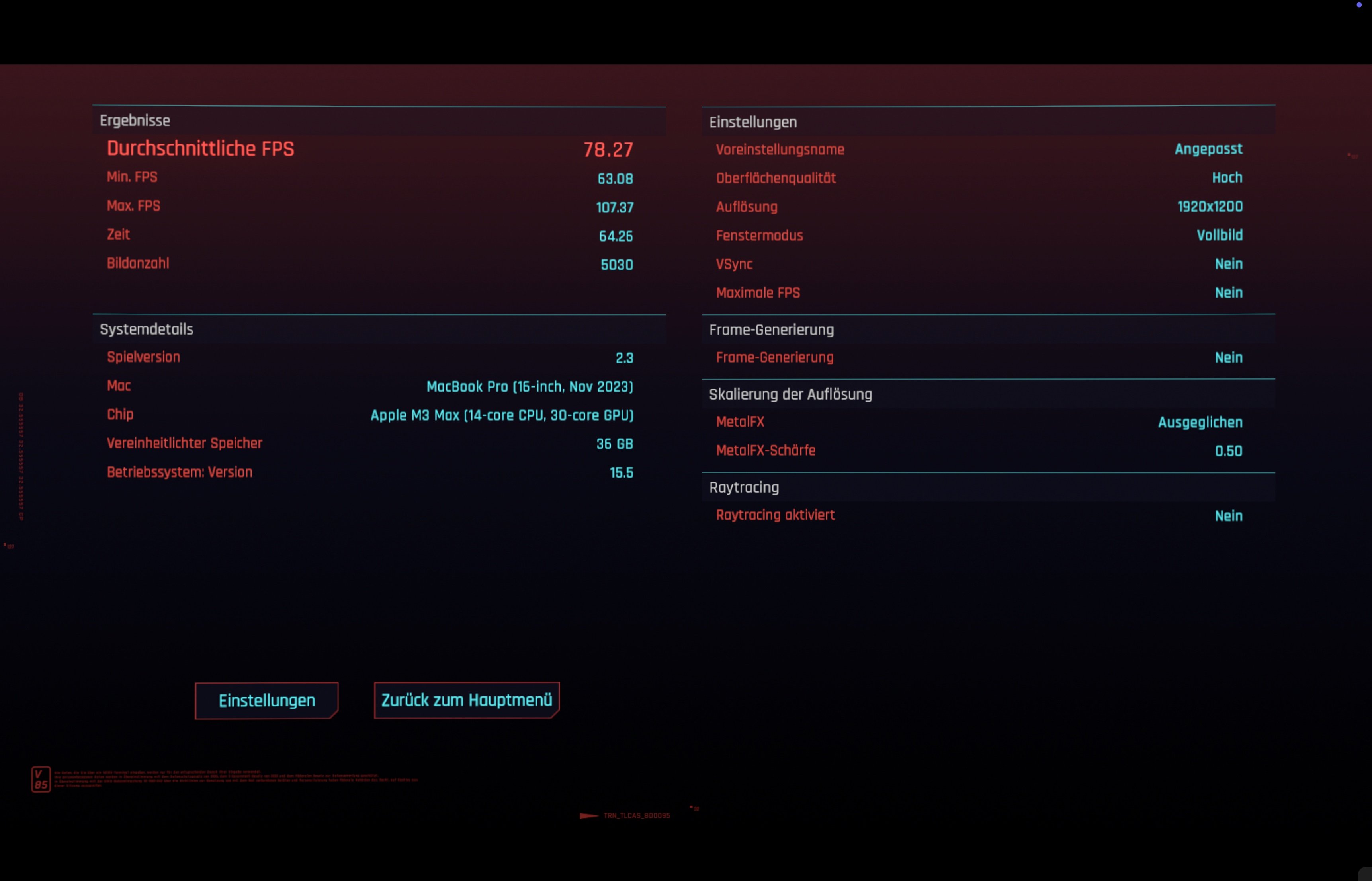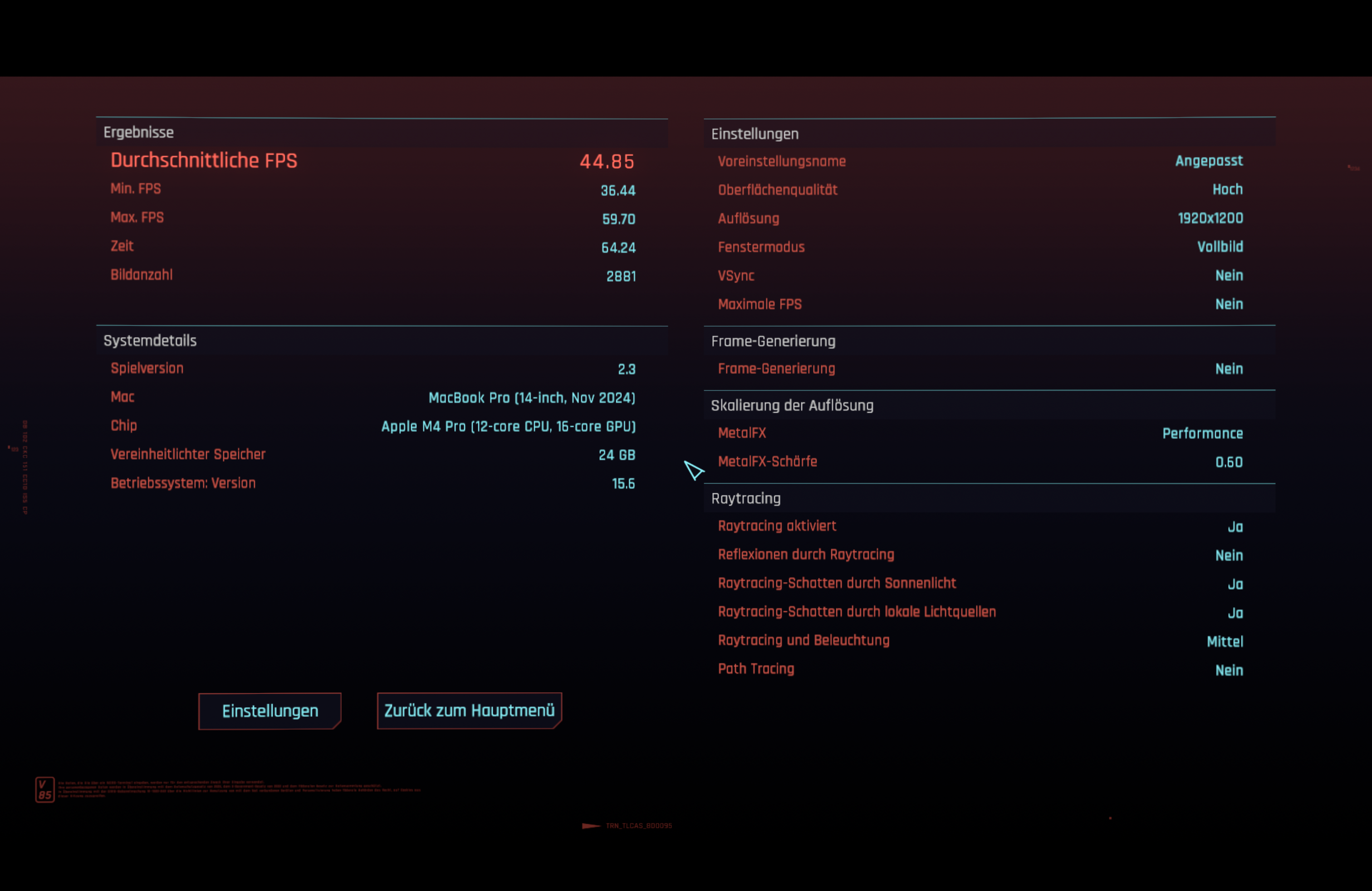1.920 × 1.080, Preset „Raytracing: Mittel“, MetalFX „Performance“: 53,10