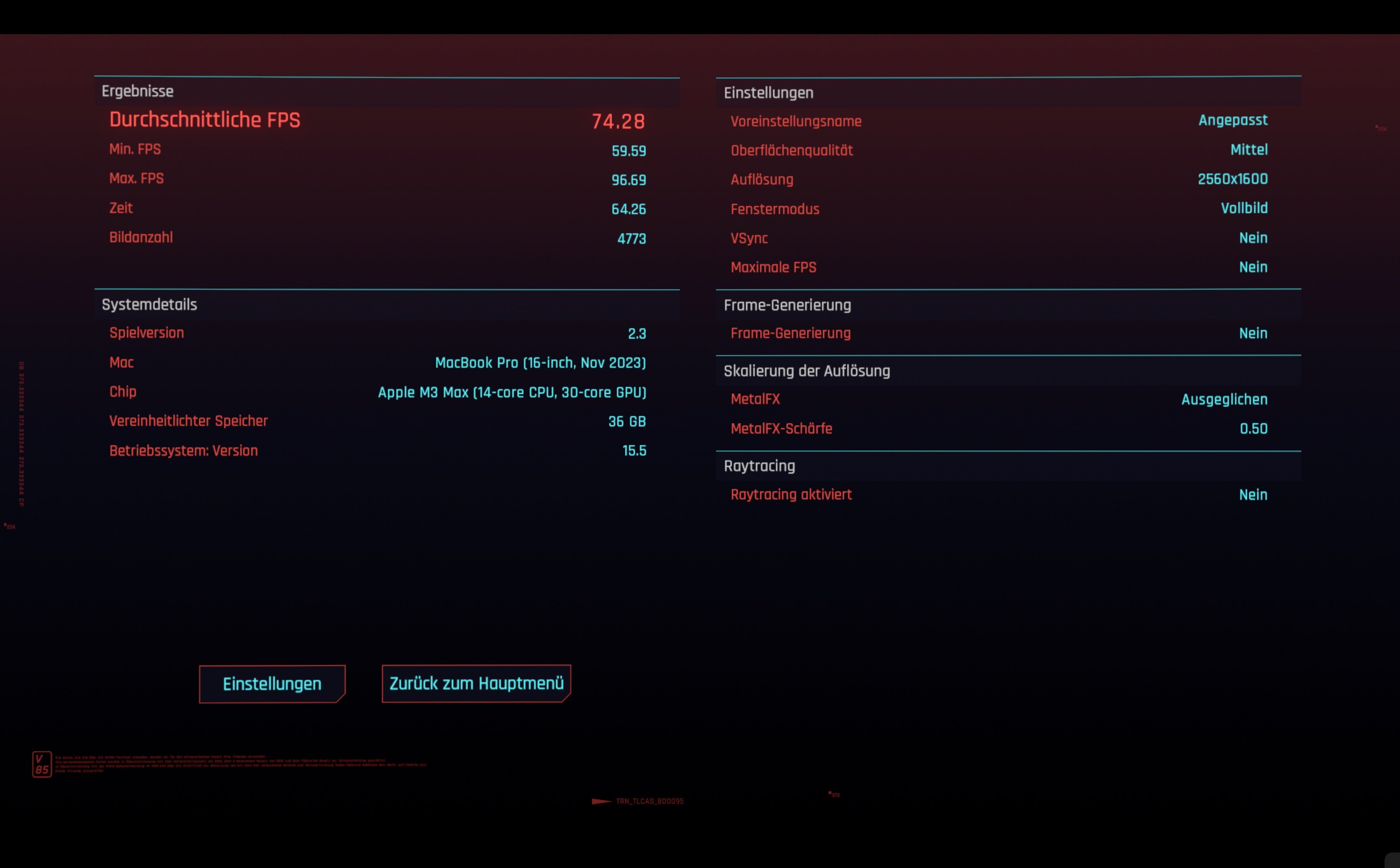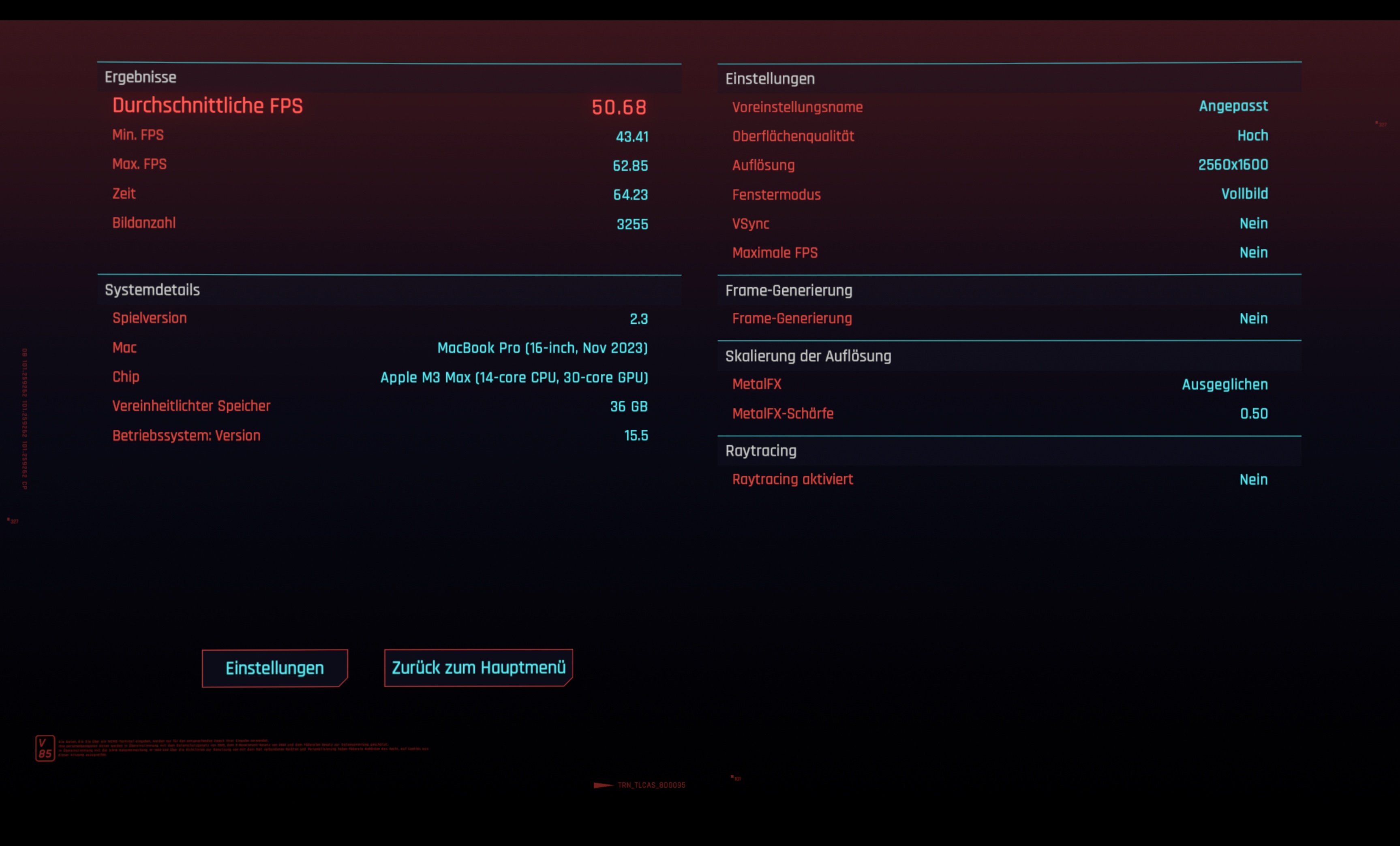 2.560 × 1.600, Preset „Raytracing: Mittel“, MetalFX „Performance“: 32,77