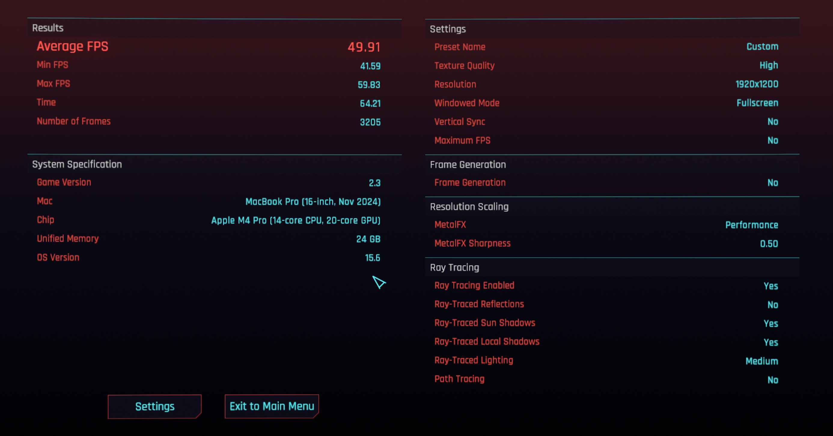 1.920 × 1.200, Preset „Raytracing: Mittel“, MetalFX „Performance“: 49,70