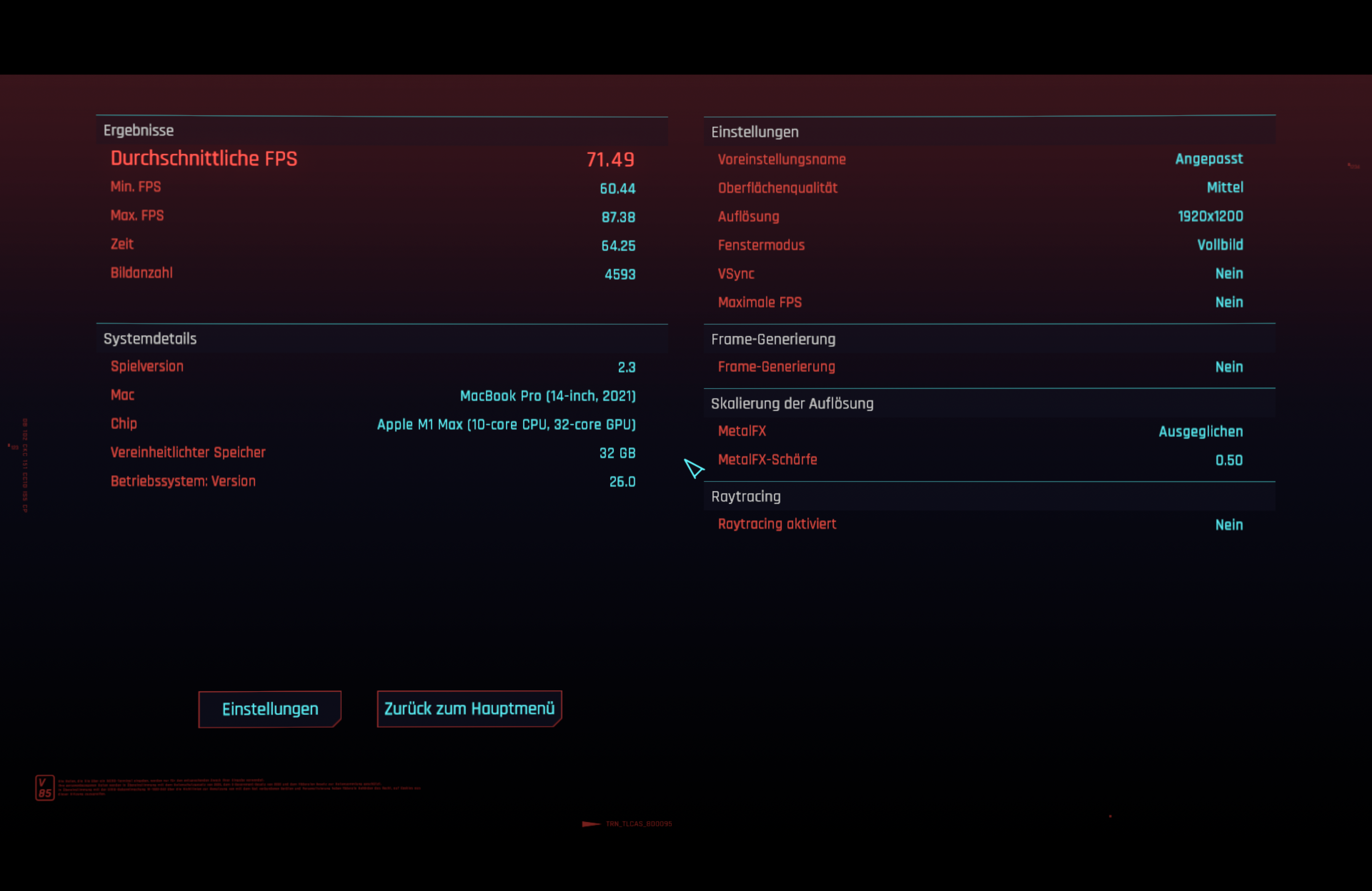 1.920 × 1.200, Preset „Mittel“, MetalFX „Ausgeglichen“: 71,49