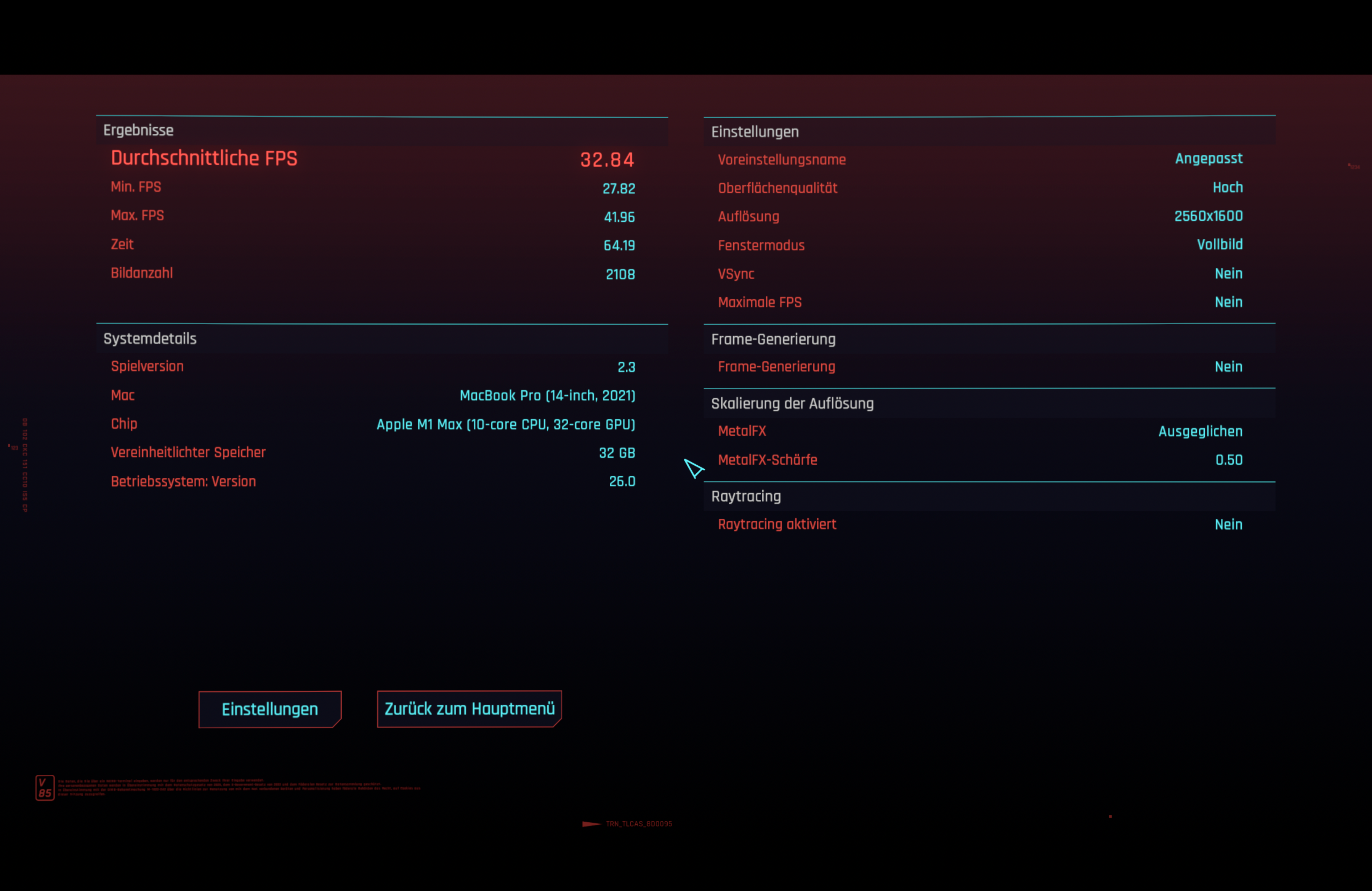 2.560 × 1.600, Preset „Ultra“, MetalFX „Ausgeglichen“: 32,84