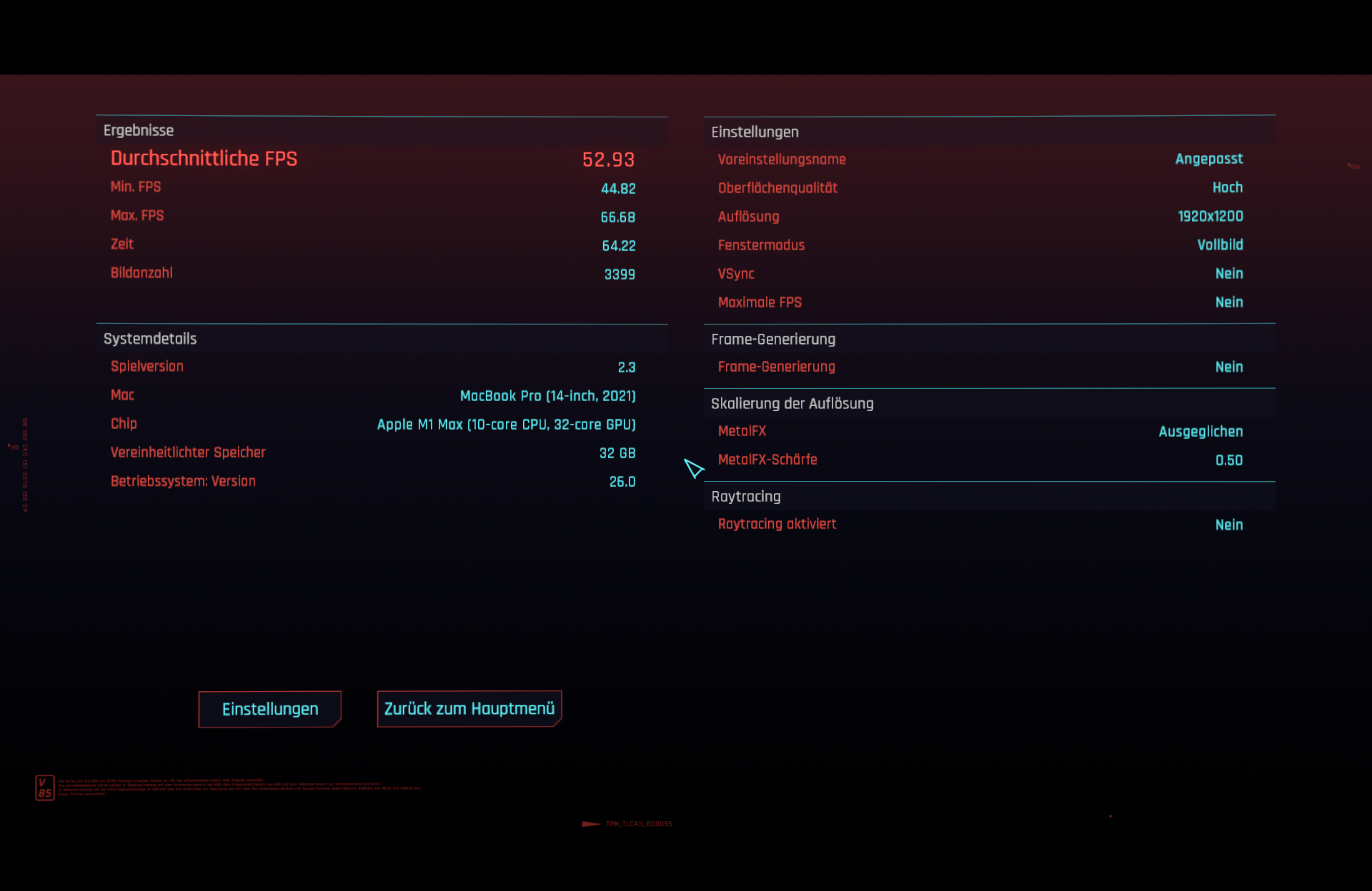 1.920 × 1.200, Preset „Ultra“, MetalFX „Ausgeglichen“: 52,93