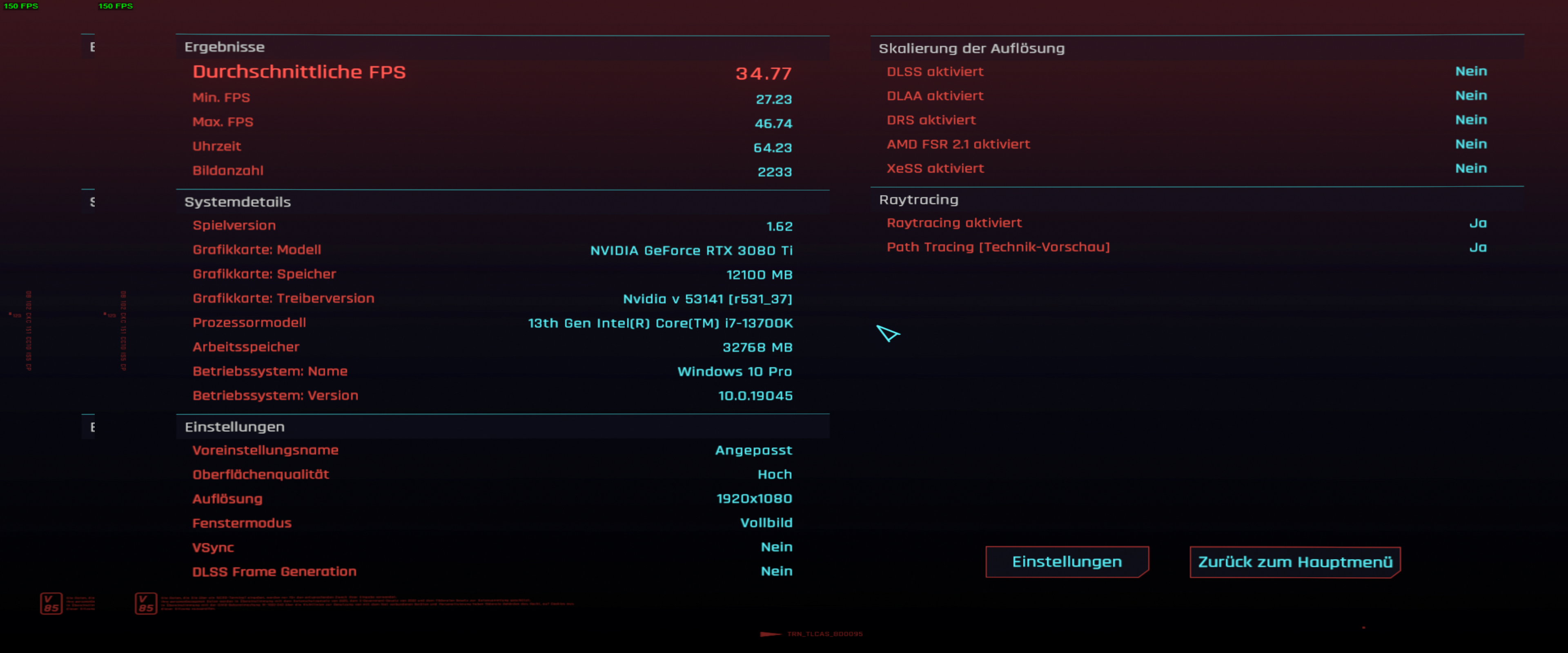 2.560 x 1.440, DLSS „Performance“ + Frame Generation: 152,9