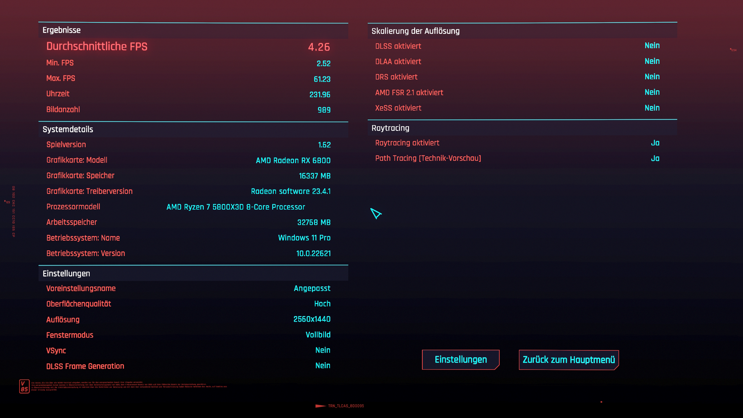 Ich habe ein komisches Phänomen entdeckt und zwar, werden die DLSS Qualitätssettings im Hauptmenü nicht gleich übernommen. Bei mir hat es dazu geführt, dass ich zwar Perfomance eingestellt hatte, der Benchmark aber im automatischen Modus durchlief. Erst nach dem ersten Benchmarkdurchlauf wurde der Perfomance Modus angenommen. Dieses verhalten konnte ich nun mehrmals reproduzieren.
