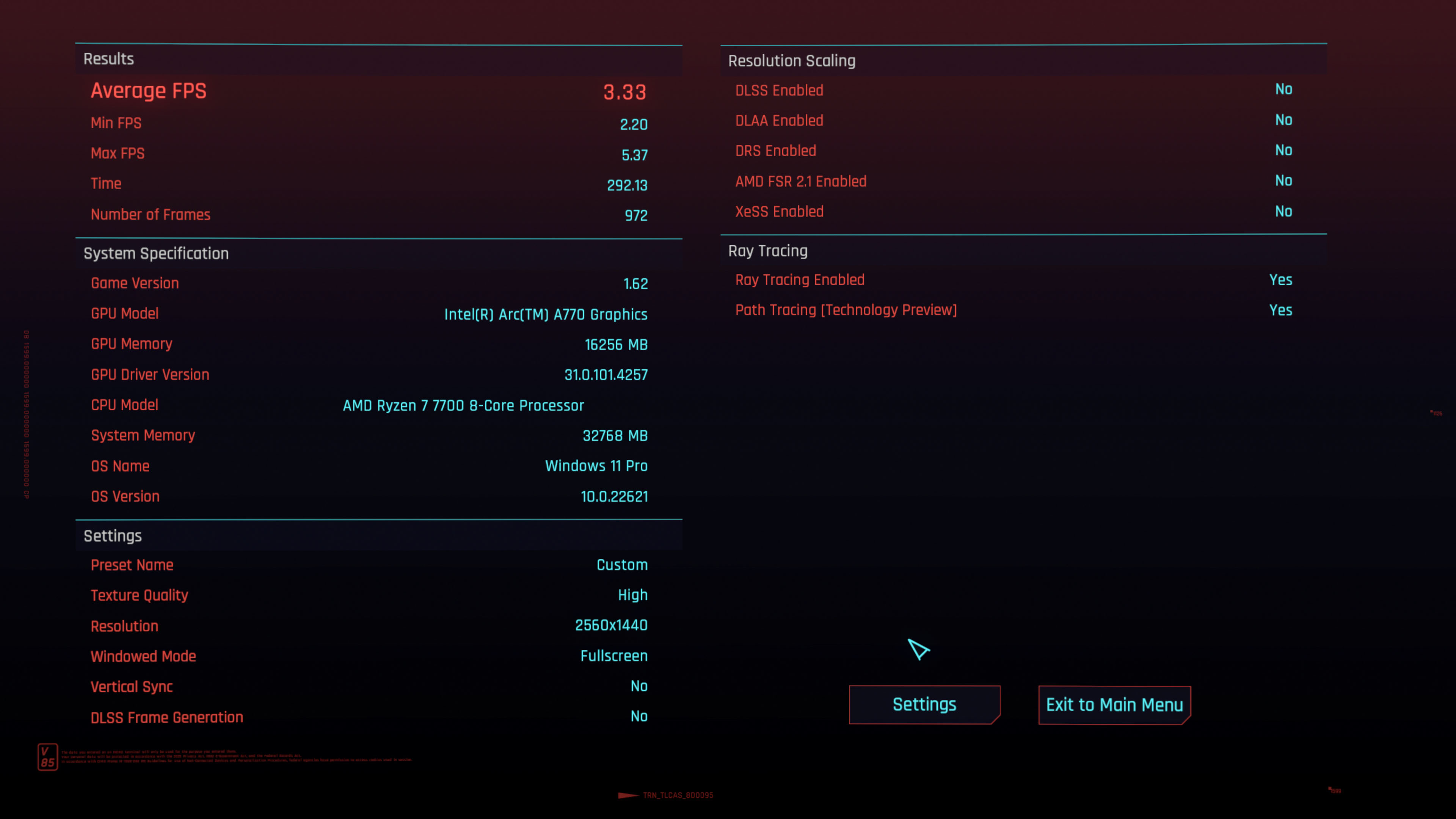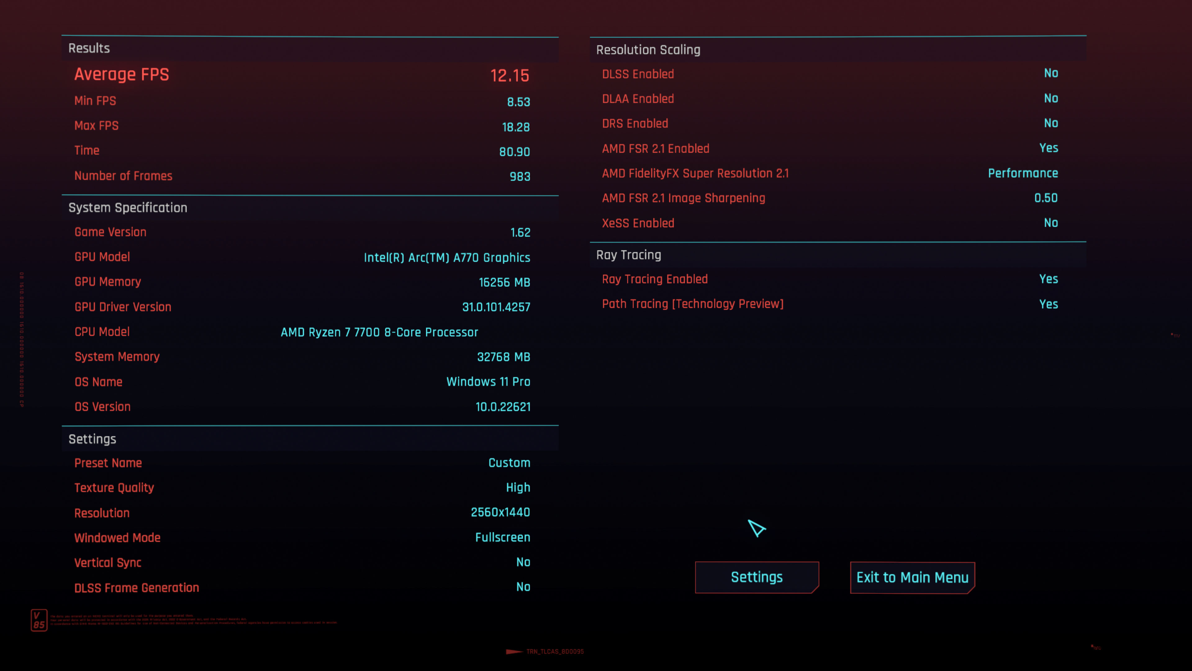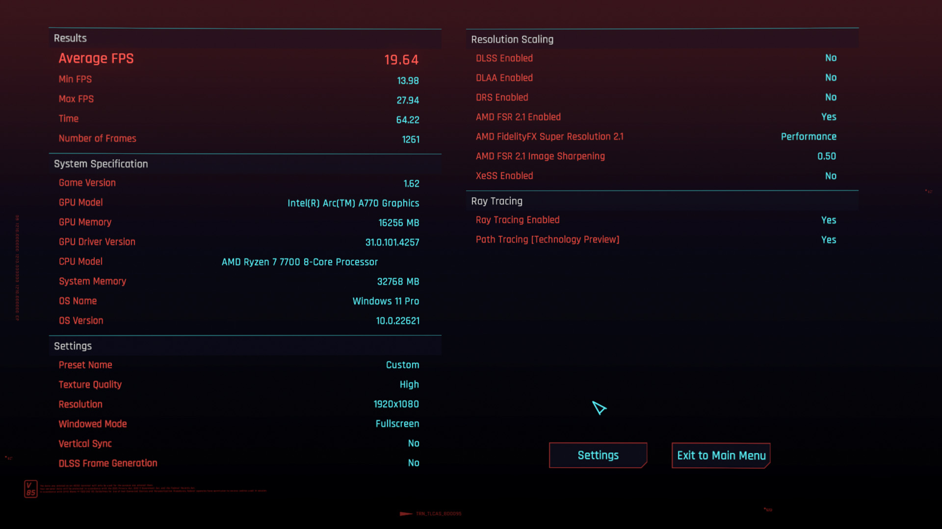 Das kleine Bastel-Upgrade auf einen Ryzen 7 7700 hat im Falle von Cyberpunk einfach mal garnichts geändert, wenn man die Messtoleranz-Nachkommastelle mal außen vor lässt 😉. Die CPU ist hier definitiv wohl nicht die Bremse.PegasusHunter schrieb:Interessant wäre, wie hoch die CPU-Last war. Wenns davon eine Demoversion oder nur den Benchmark gäbe, könnte ich das mal testen mit ARC 770 LE 16GB und meinem 5950x.![]()