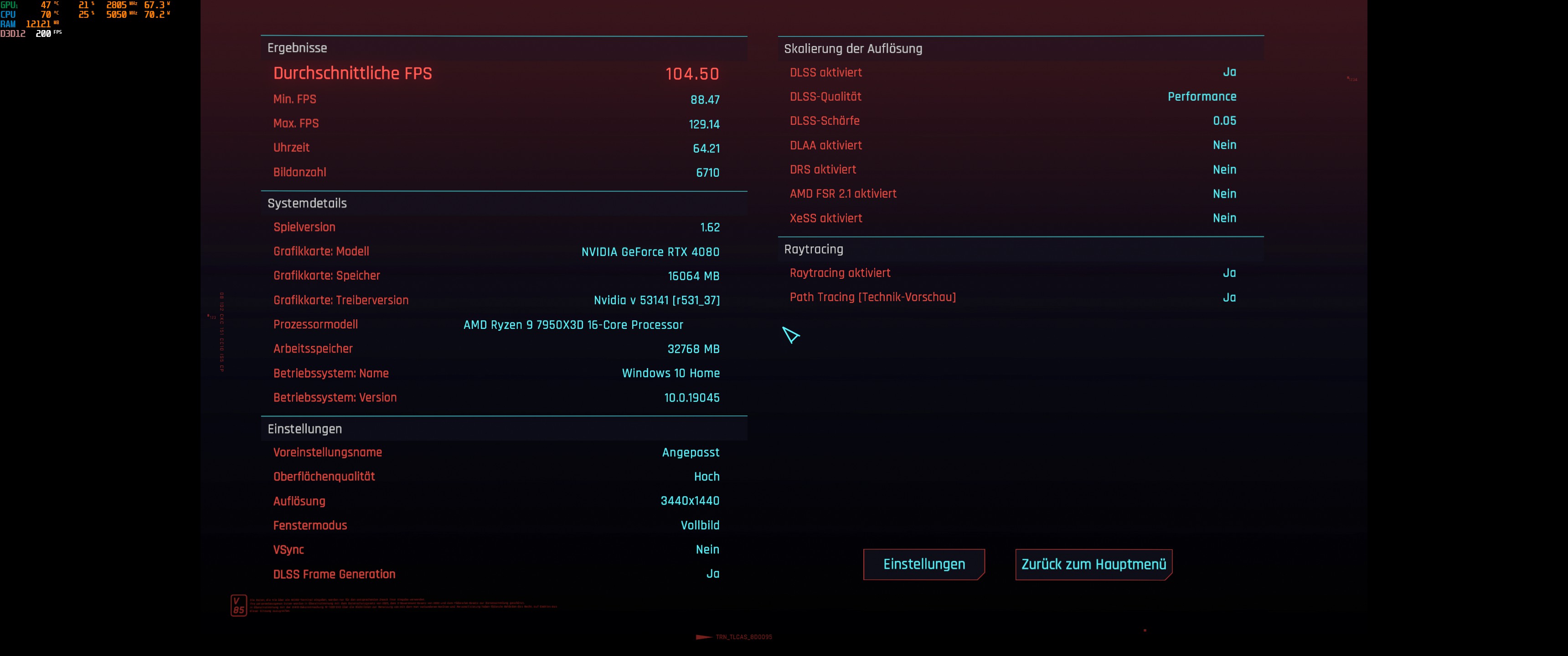 3.440 x 1.440, DLSS „Quality“ + Frame Generation: 103,75