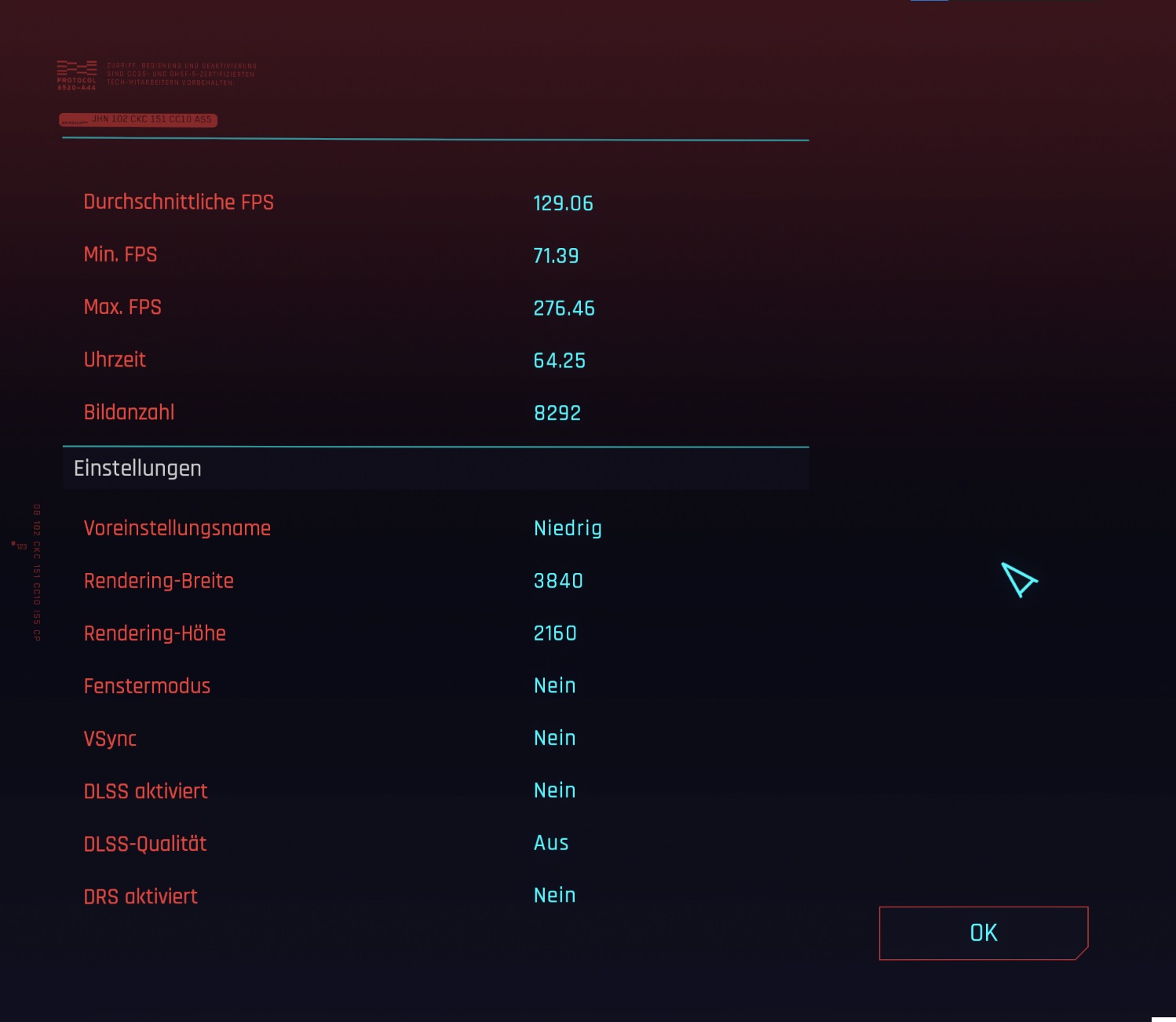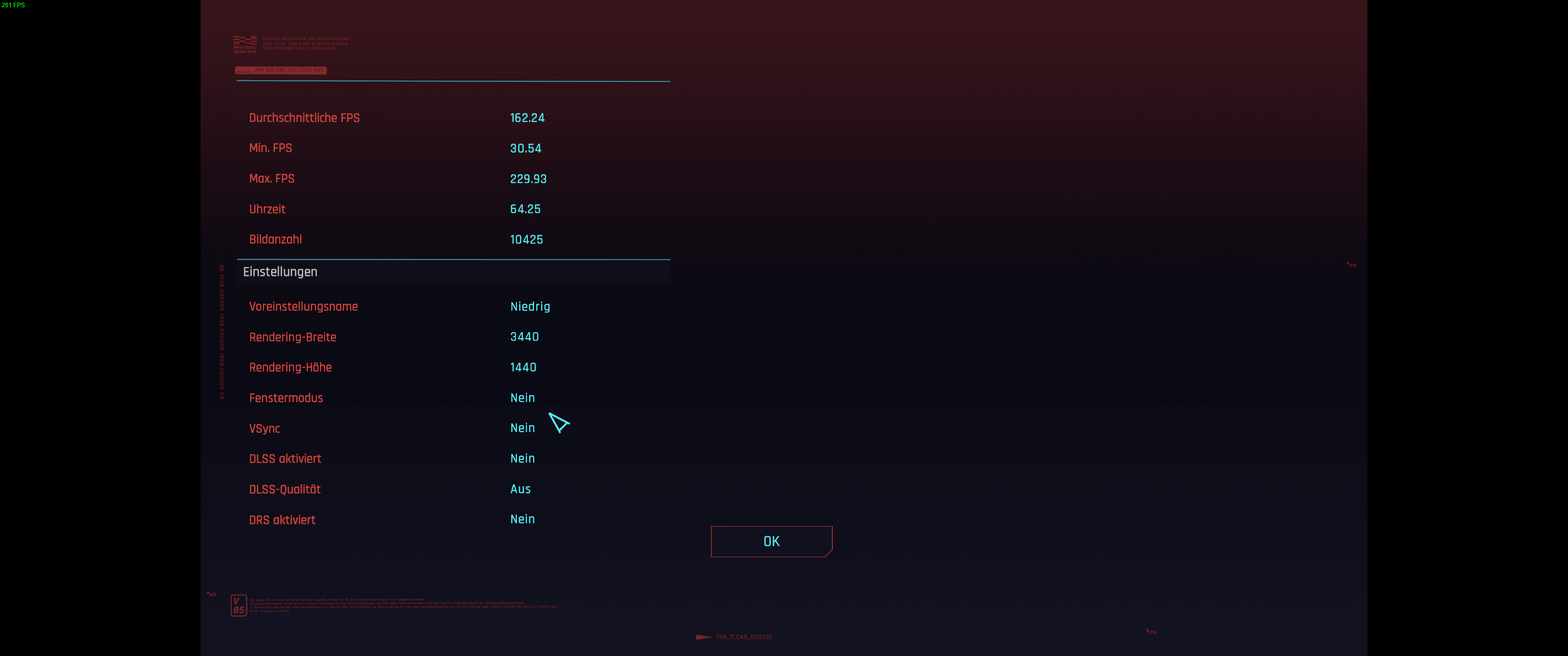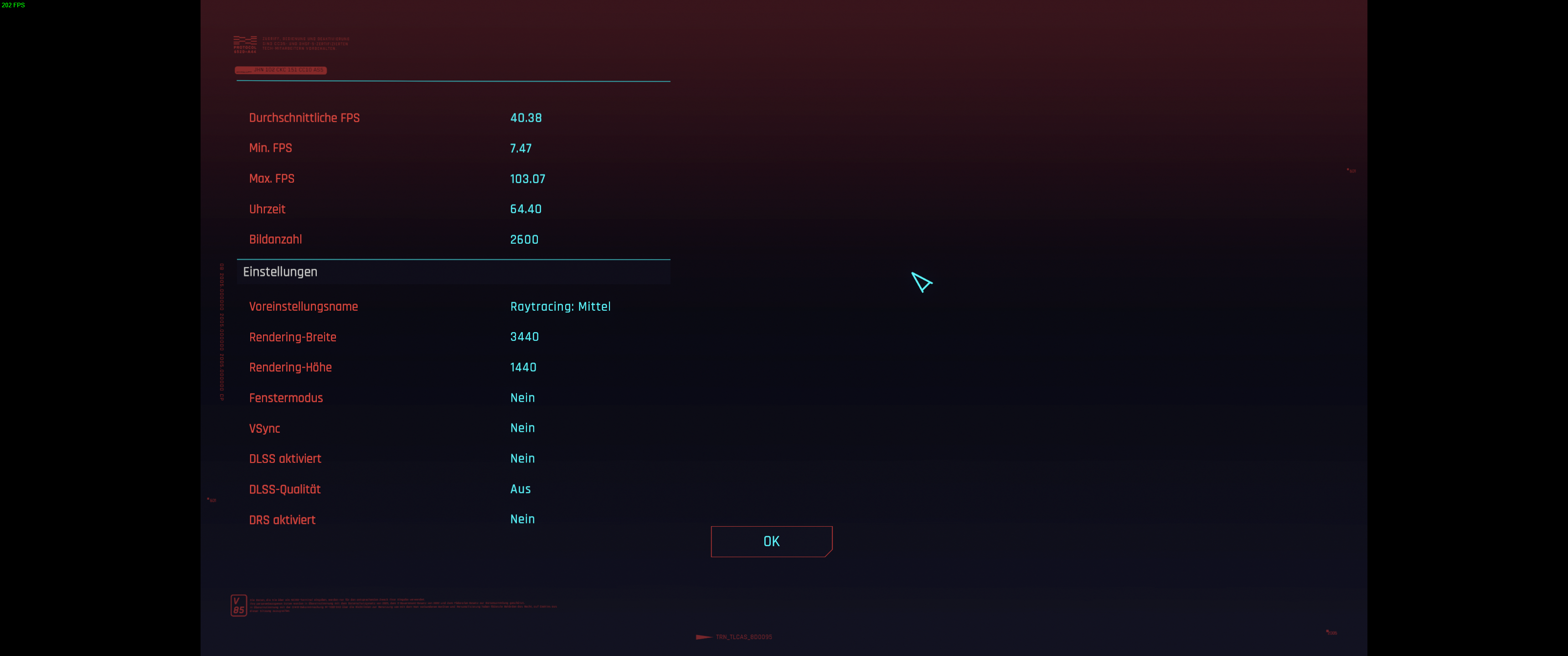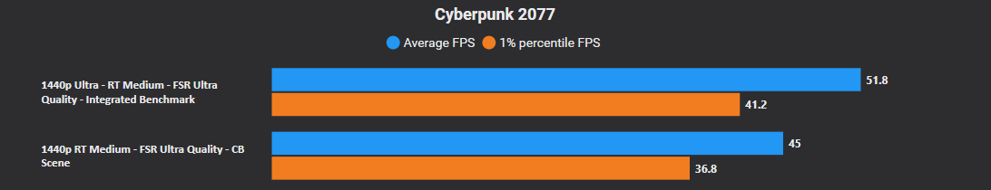 Niedriger als FSR Ultra Quality würde ich hier in 1440p wie in vielen anderen Spielen nicht gehen wollen, der Rest muss dann also aus dem Tuning anderer Settings kommen, wobei man mit 45 avg FPS(bzw 52 in diesem integrierten Benchmark oder 50 in der PCGH GPU Szene mit gleichen Settings) schon einigermaßen spielen kann.