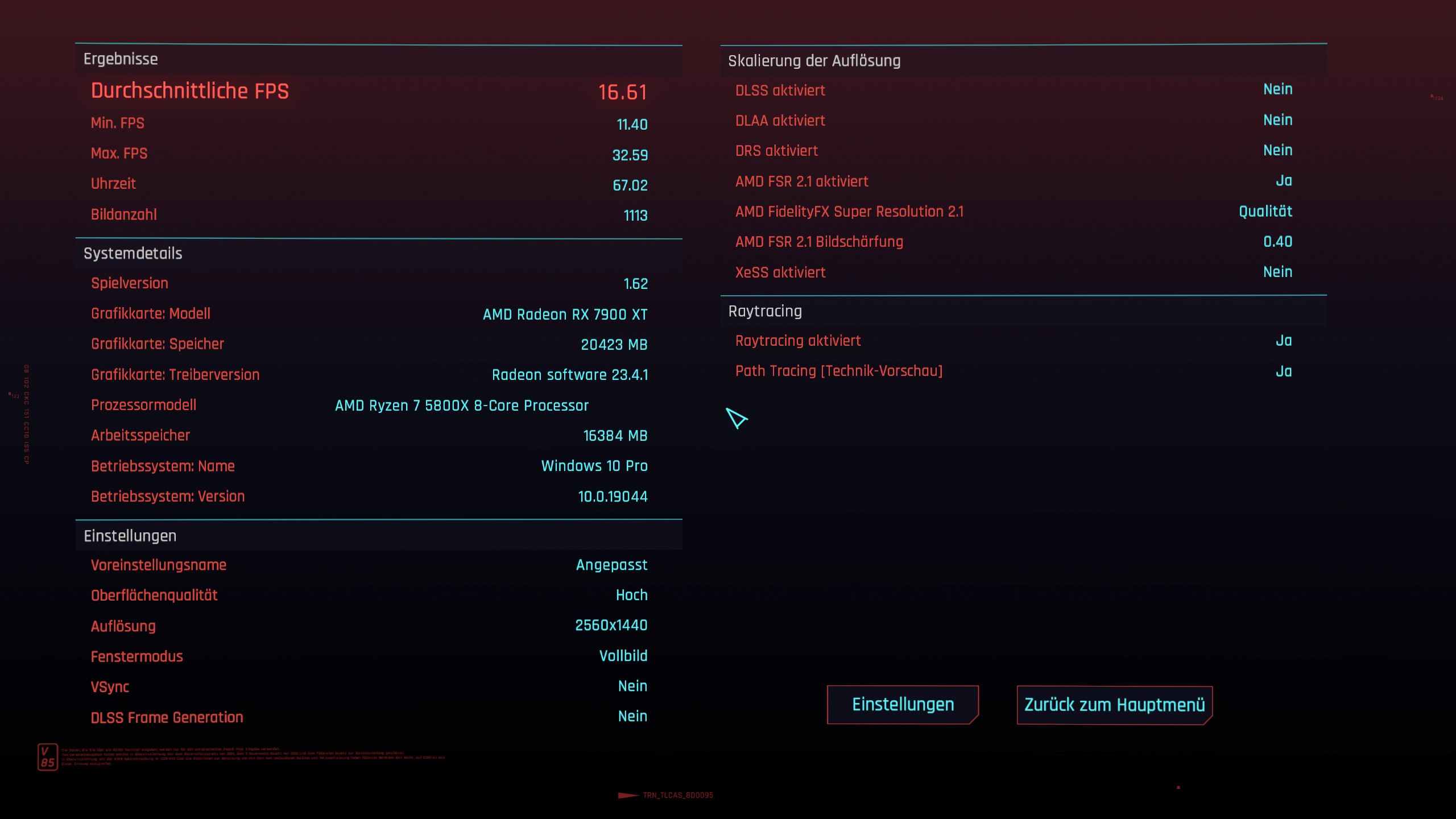 Also auf meiner 7900XT läuft es bei WQHD und FSR Quality mit 20FPS. Der Rest ist alles Hoch oder Ultra, hab die Digital Foundry optimized Settings genommen. Und es ist egal ob Quality, Balanced oder Performance. Bringt bei mir nur max. 10FPS mehr und das Bild ist deutlich unschärfer.