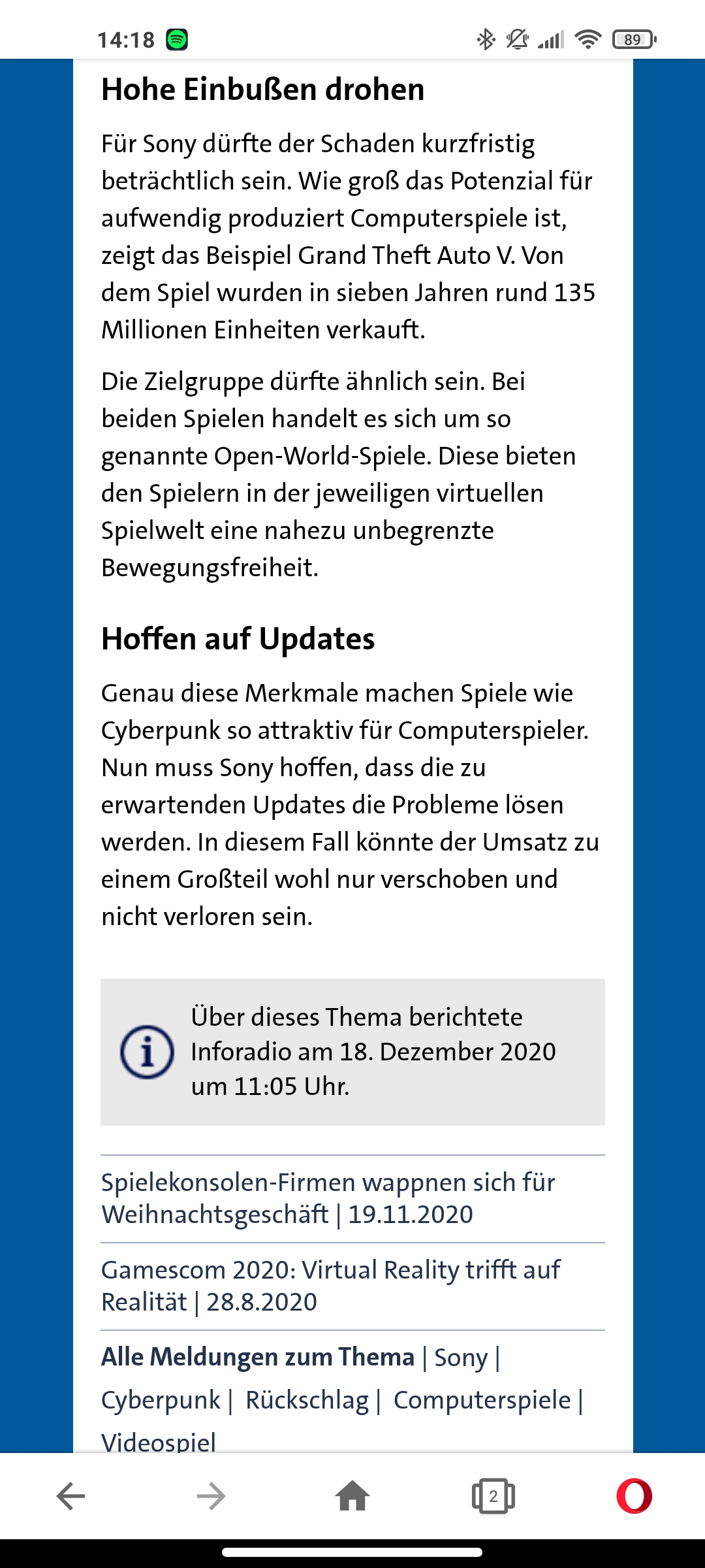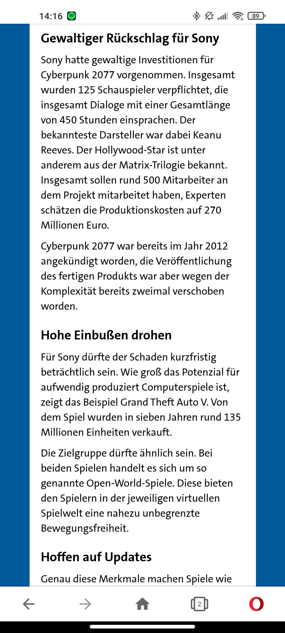 Wo ließt du das denn im Artikel? Vorallem steht da eben nicht das es eine Eigenentwicklung ist "des japanischen Elektronikkonzerns sind offenbar gravierende Mängel am von der polnischen Entwicklerfirma CD Projekt Red produzierten Spiel." Aus dieser Formulierung geht schon herraus das Sony hier der Verkäufter ist und CDPR der Entwickler. Die Investitionen sind ebenfalls nicht von als von Sony ausgehend bschrieben sondern als allgemein: "Für Cyberpunk 2077 waren gewaltige Investitionen geflossen."