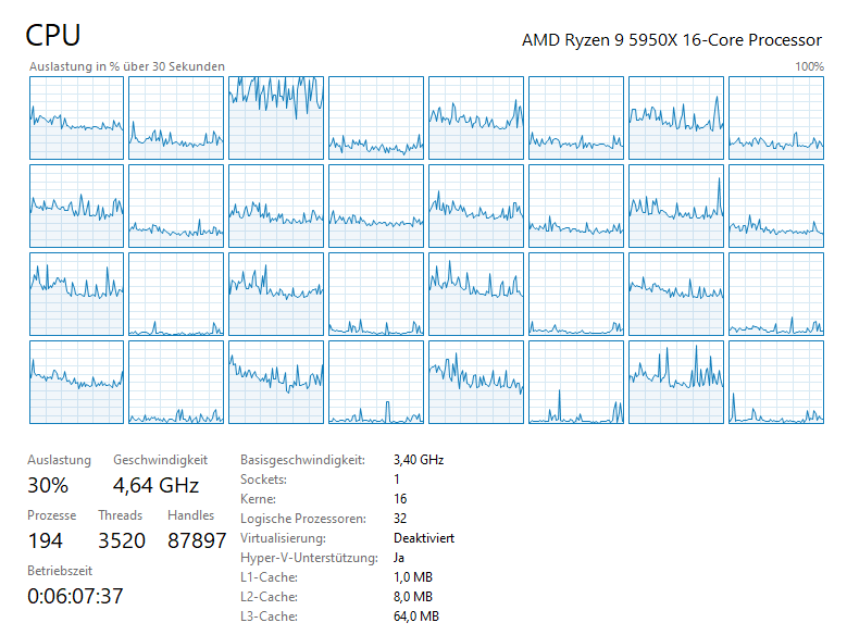 Kannst ja auch mal den TaskManager bemühen, hier z.B. meine Auslastung vom 3700x, bei Fahrt durch die Stadt.