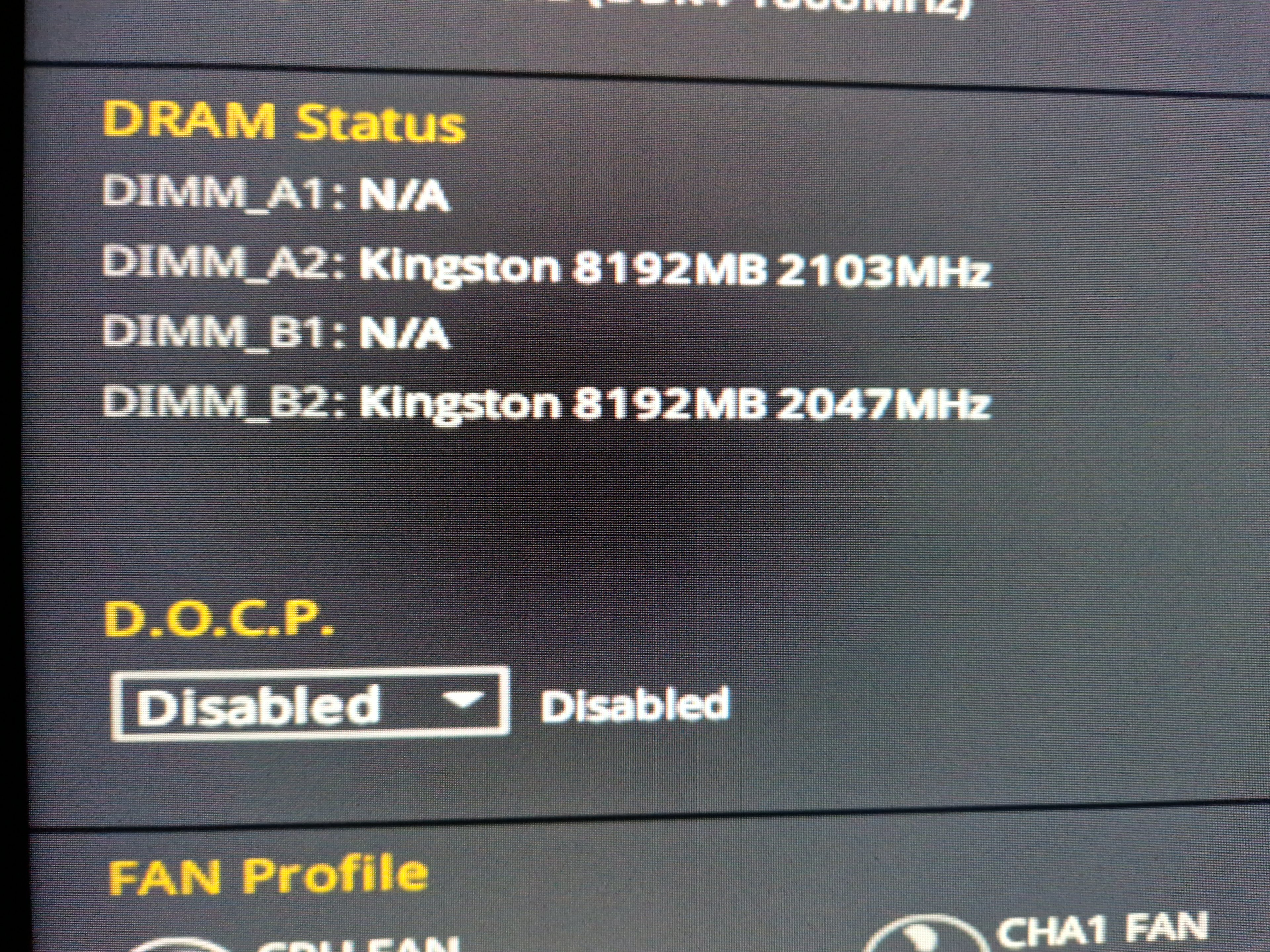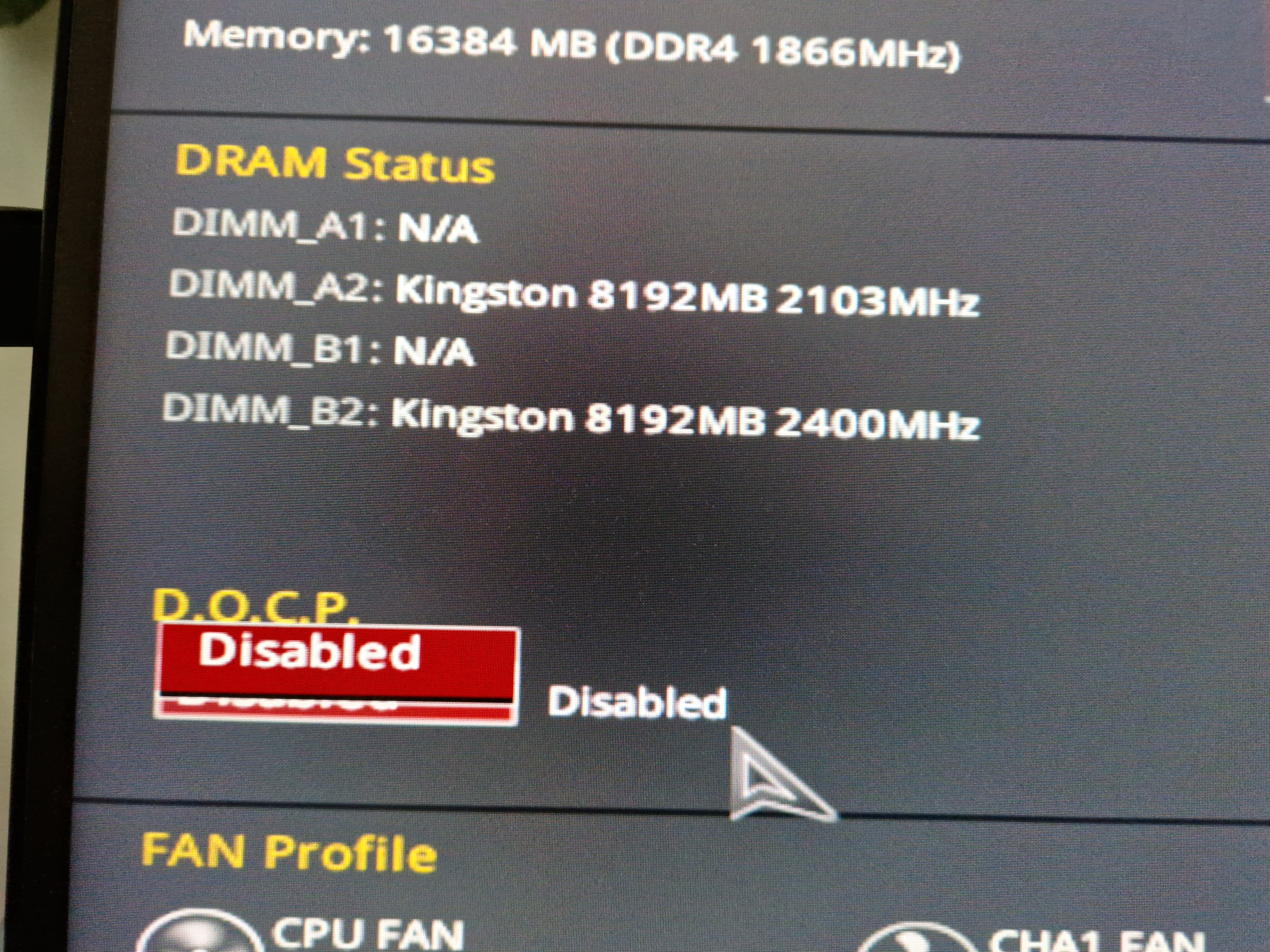ich weiß leider nicht genau wie lange schon, aber im Moment kann ich bei meinem RAM nicht mehr das D.O. C. P. Profil aktivieren. Im AI Tweaker gibt es die Auswahlmöglichkeit einfach nicht mehr und im ez mode gibt es wie im Bild zu sehen nur die deaktivieren Option. Auch auffällig ist, dass die beiden (eigentlich identischen) Module mit unterschiedlichen Geschwindigkeiten erkannt werden (im Bild zu sehen).