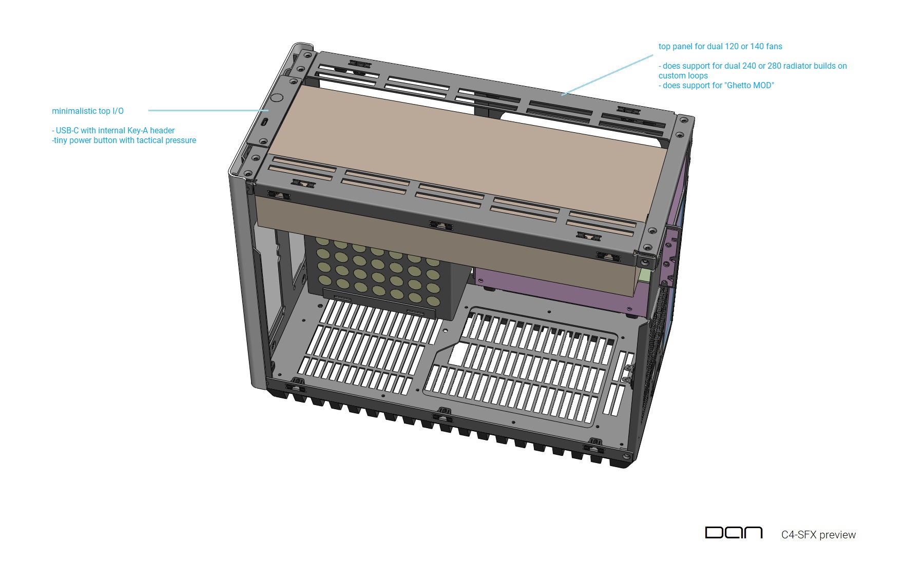 - Luftkühlung? Wie sieht ein konkretes Luft-Kühlungskonzept mit einem C14S aus? Das eher unübliche Layout mit der GPU oben macht es zumindest für mich schwierig mich da reinzudenken. Oben GPU intake, seitlich C14S intake, seitlich PSU intake. Wo soll die ganze Luft wieder raus? Ist unten noch genug Platz für Lüfter?