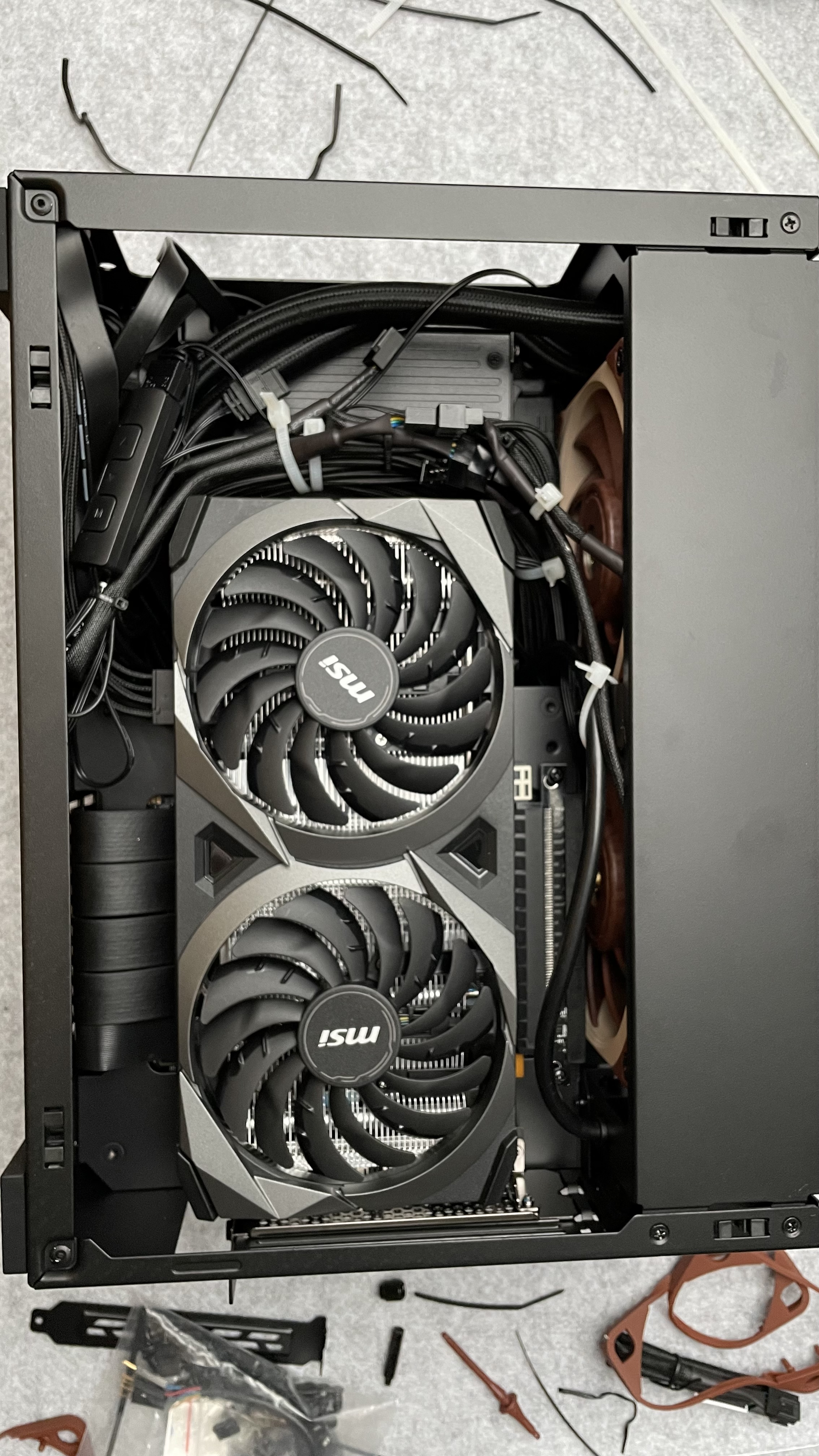 Die Lüfterkabel bei der Grafikkarte runterlassen ist clever. Ich hab sie vorne rum und mich dauernd aufgeregt.