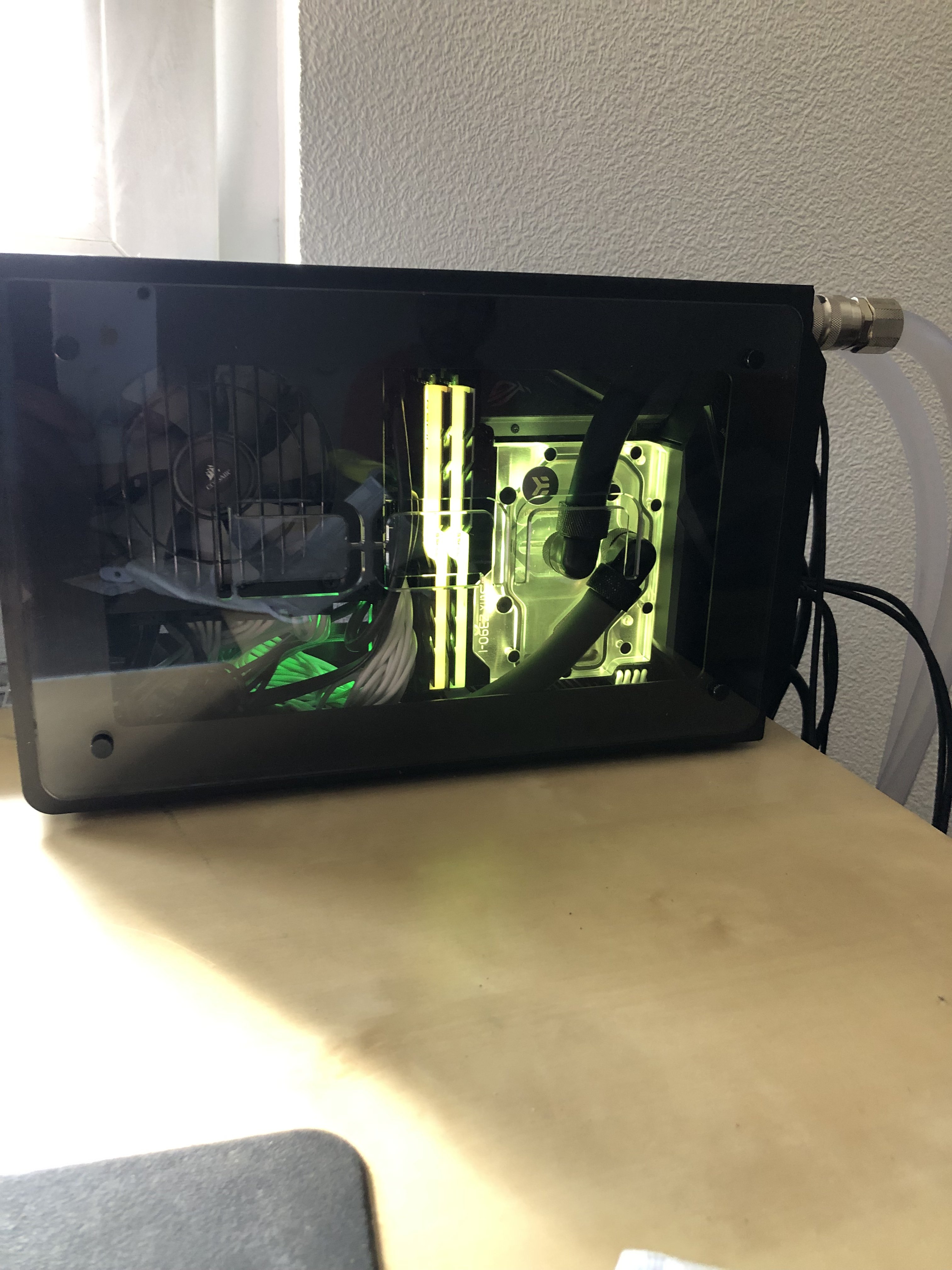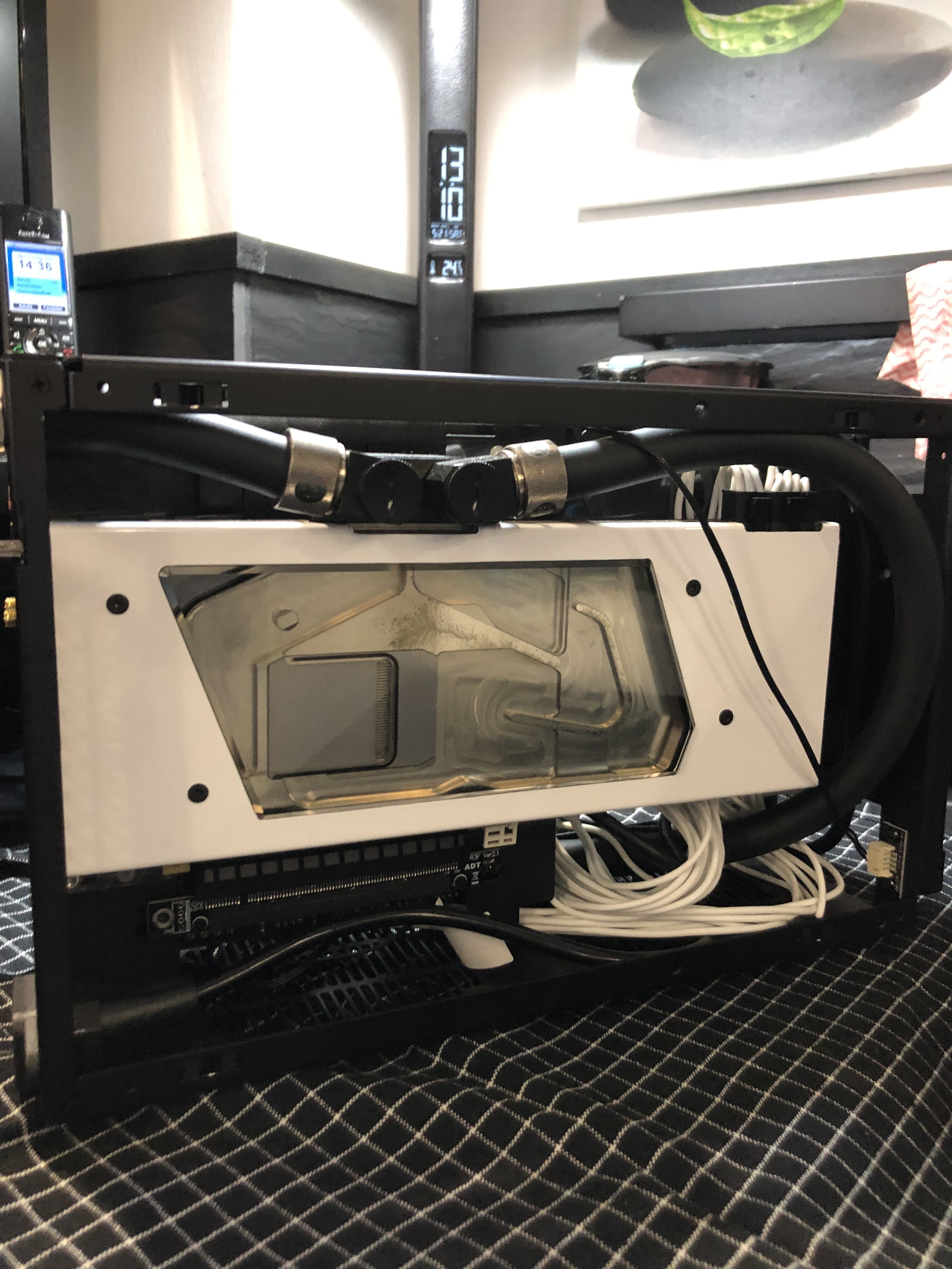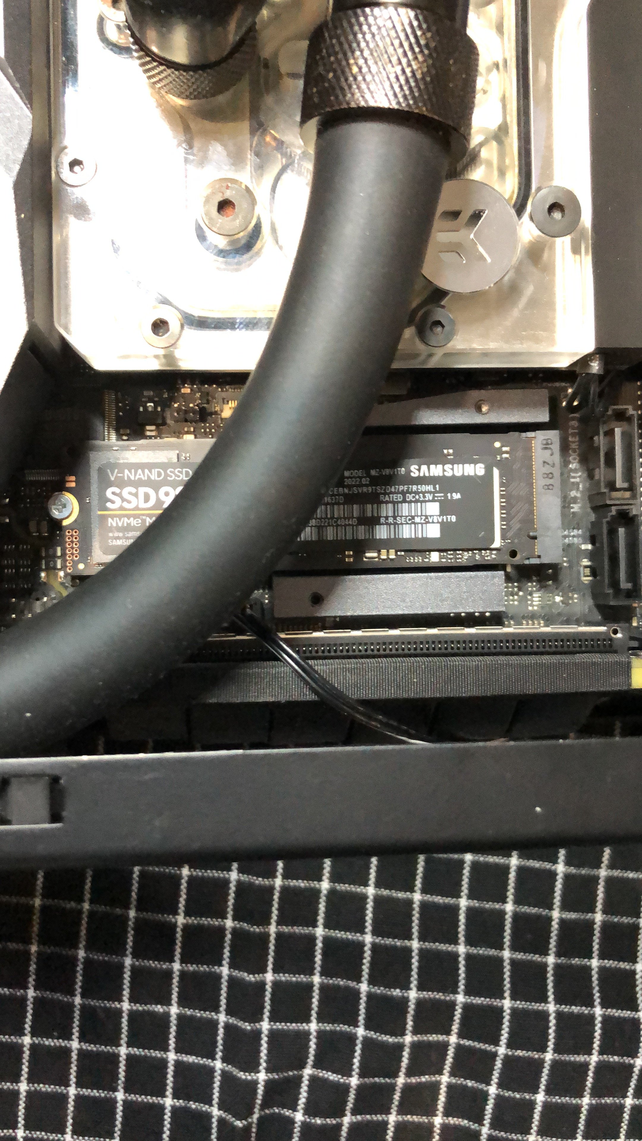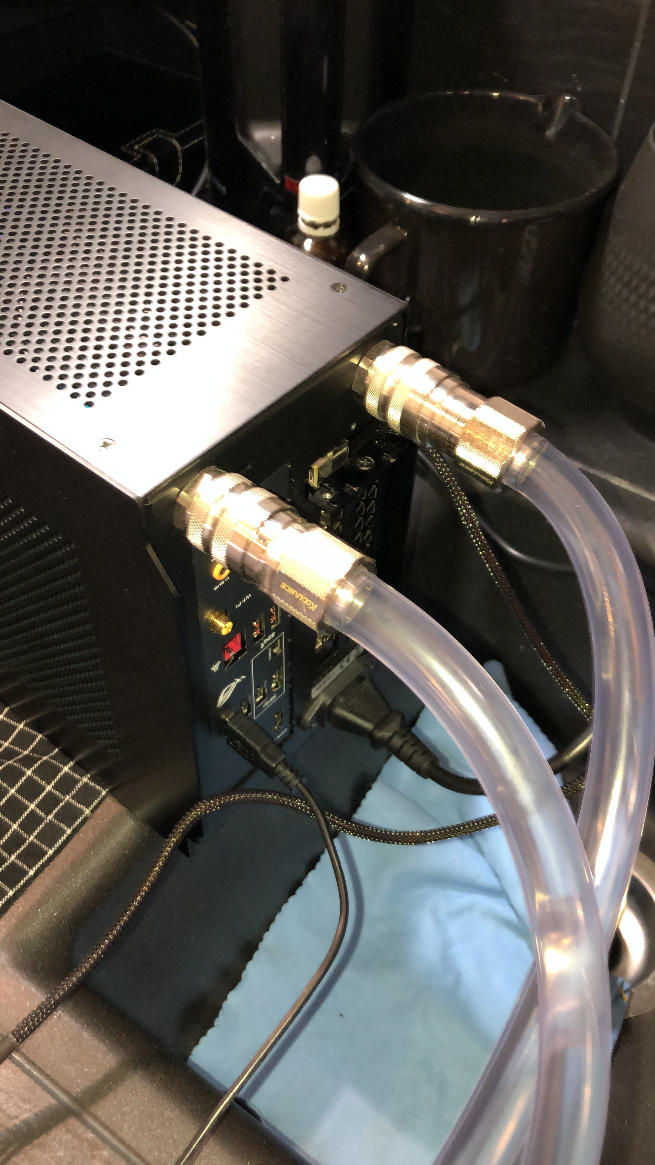 Die EK-AiO oben rum ist tatsächlich etwas Gefrickel und ich musste wirklich die Schläuche immer mal wieder etwas nachjustieren, damit sie der Lüfter ständig mitnimmt. In dem Zusammenhang wäre das mit einer anderen AiO und Schläuche unterm Netzteil sicher einfacher gewesen. Wobei das unterm Netzteil ja durchaus auch was enger wird.