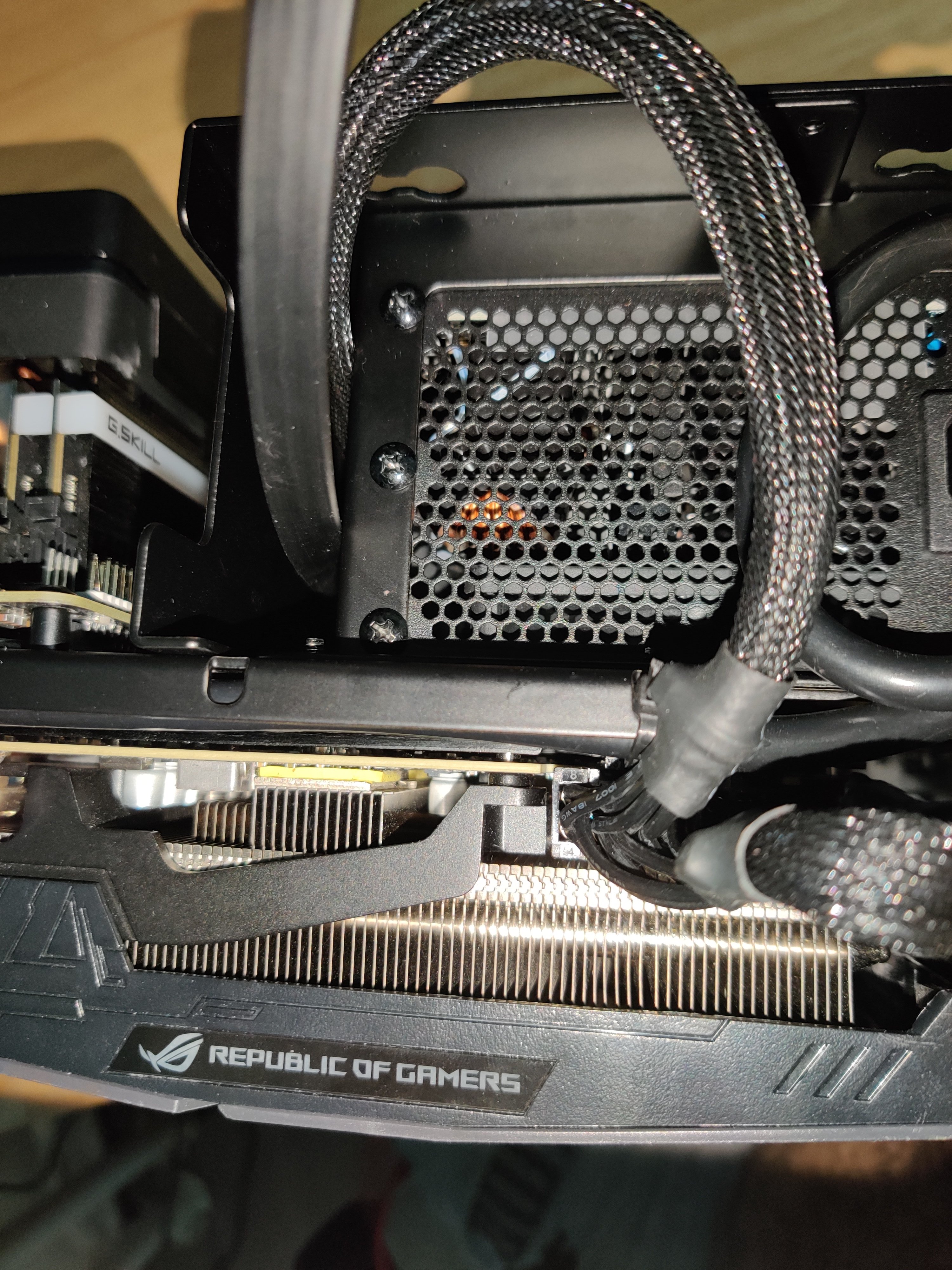 Zweites Problem: Die Stromanschlüsse zu der Grafikkarte sind leicht hinter dieser L-Form und damit nicht einfach anzubringen. Zwischen Grafikkarte und dem Mittelstück des Gehäuses ist auch kaum Platz, sodass erst die Grafikkarte und dann der Stromanschluss entfernt werden kann.