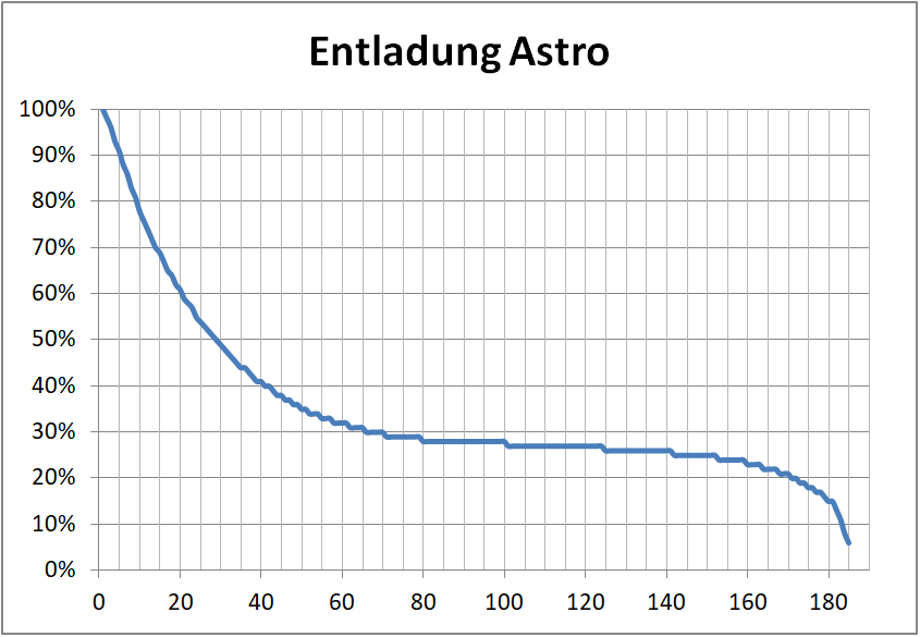 Unabhängig von der enttäuschenden Akkukapazität: die Entladekurve ist stark ausgeprägt nicht-linear. Anfangs entlädt der Akku mit ca. 2 Prozentpunkten pro Minute, um dann im Mittelfeld abzuflachen und kaum noch Entladung anzuzeigen - bis das untere viertel angebrochen ist und sich Entladung wieder stark beschleunigt. Die Grundform dieses Graphen ist zwar gängige Praxis (alle Akkus zeigen im Grunde dieses Verhalten), aber das Ausmaß hier ist extrem. Schlechte Zell-Chemie? Billig-Akku? Falsch gelagert oder durch langes Tiefentladen (s.o. zum Thema, wie er geliefert wurde) beschädigt? Wer weiß. Zum Zeitpunkt der Akku-Tests hatte der Laptop aber schon einige komplette Lade- und Entlade-Zyklen hinter sich, eine ggf. nötige Kalibrierung sollte also bereits erfolgt sein.