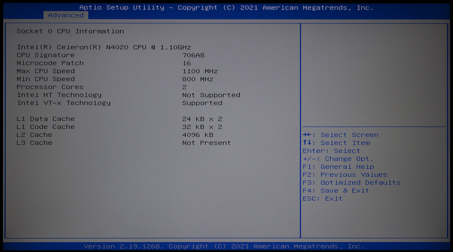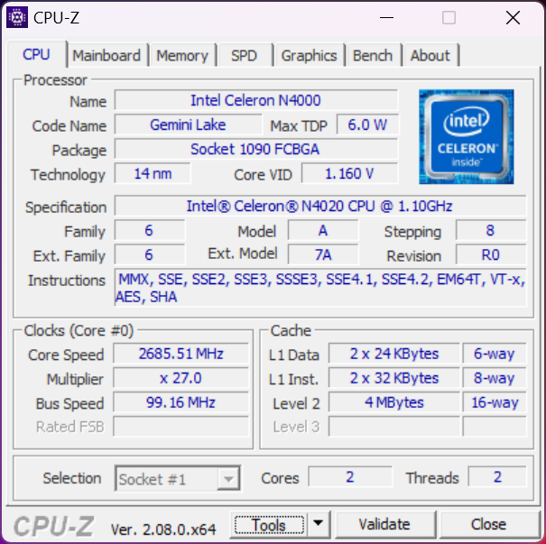 | CPU | Intel Celeron N4020, 2C/2T, 1.1-2.8 GHz, 4 MB Cache, 4.8W SDO (Gemini Lake Refresh, 14nm) |