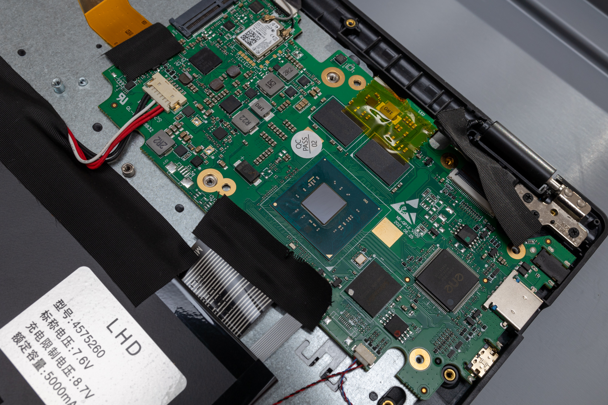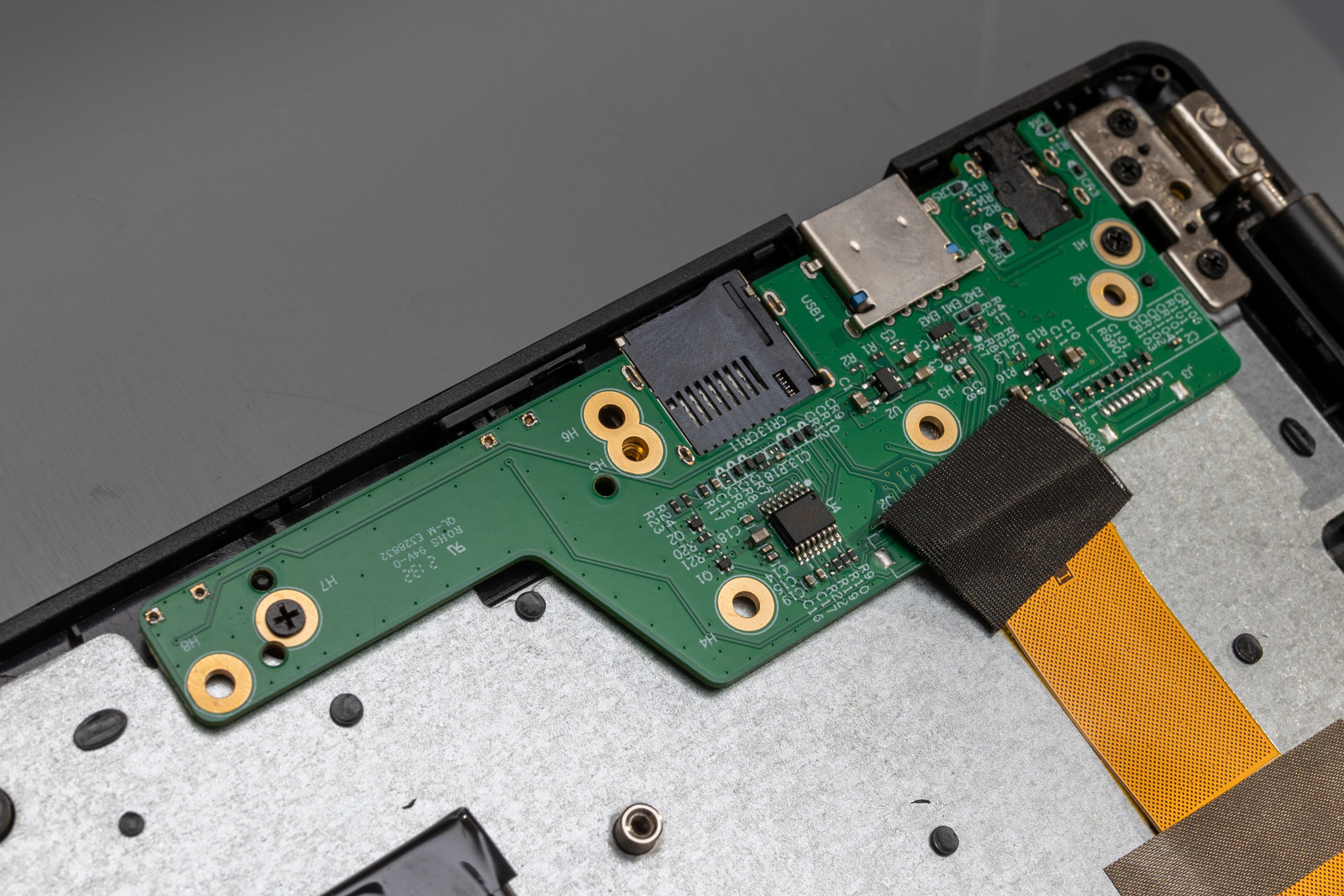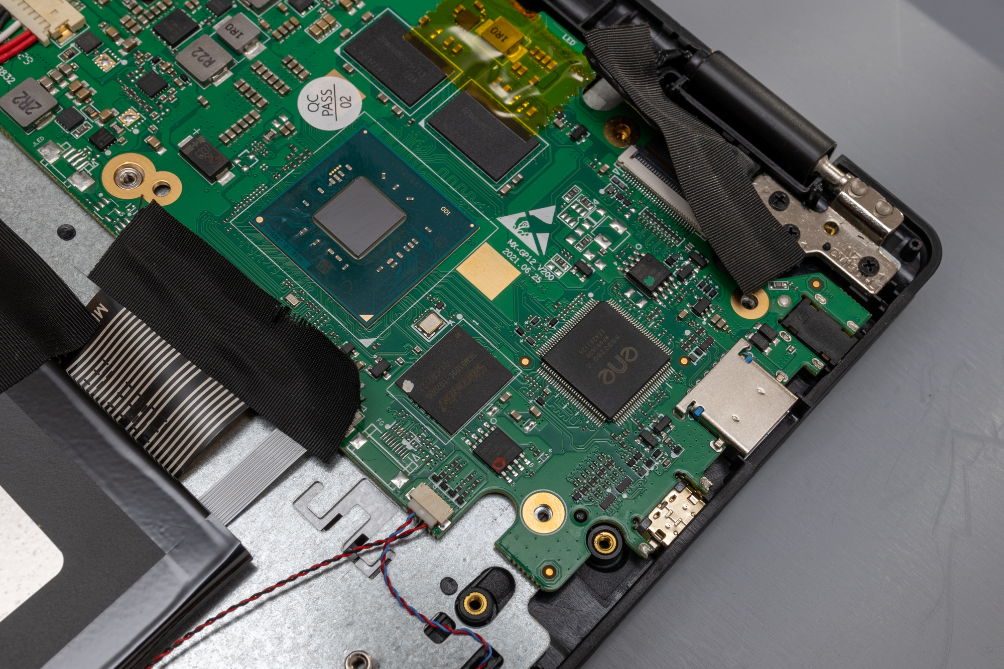 Das Neo 360 X lässt sich fast gemütlich öffnen: 13 identische Phillips-Schrauben und ein wenig Hebeln mittels Spudger offenbaren das wenig prunkvolle Innere. Die kleine Hauptplatine in der einen Ecke, ein Schwesterbrett in der anderen. Darunter der 5000 mAh-Akku; ein paar Flachbandkabel und… der Rest ist Gehäuse. Bzw. Tastatur, Trackpad und Display.