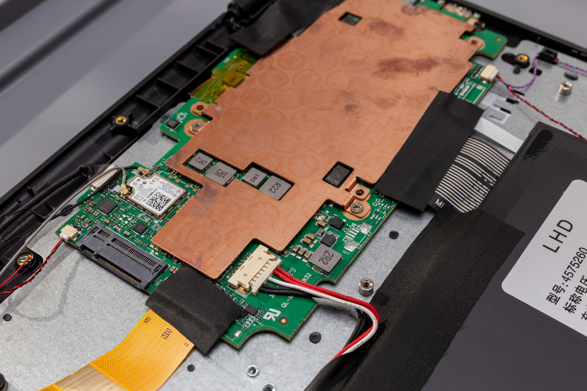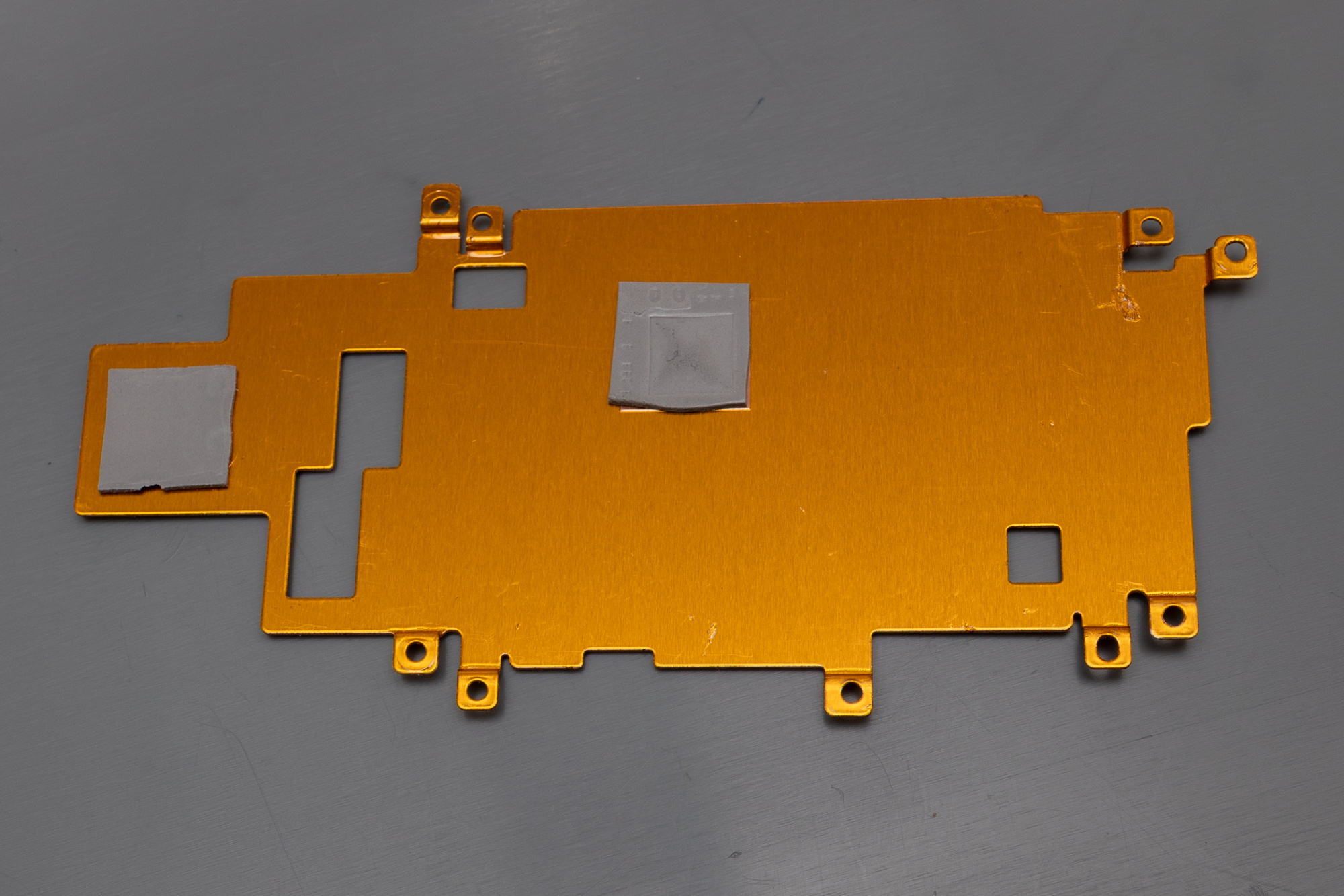 Die Hauptplatine wird von einem Kupferleitblech überdeckt, dass die Aufgabe hat primär die Wärme der CPU aufzunehmen und zu verteilen (bzw. an das Gehäuse weiter zu reichen, dass an dieser Stelle ebenfalls noch eine Wärmeleit-Aufkleber hat). Man beachte das Muster auf dem Kupfer als auch die Fingerabdrücke, die weder von mir stammen noch sich entfernen ließen.