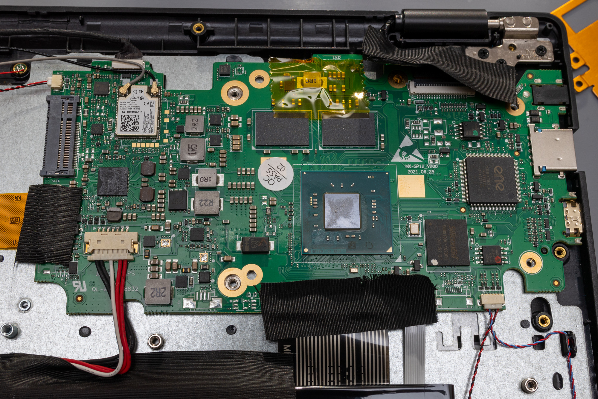 Unter der Kupferabdeckung sind CPU, RAM, IO-Chips, die eMMC, WiFi-Module sowie ein unbenutzter SATA-Connector zu erkennen.