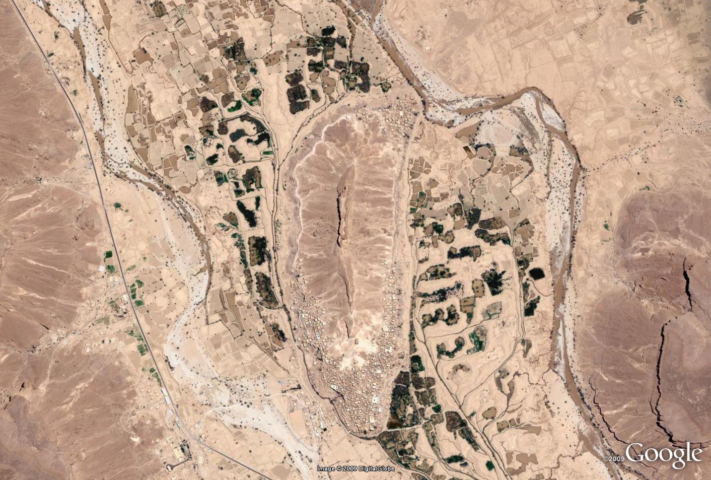 Die Gebäude sehen aus wie Lehmhütten - jedenfalls sehr heller Baustoff und kleine Gebäude. Drum herum scheint angebaut zu werden. Diverse unförmige Felder mit Wegen und unförmige Wasserbecken mit Gräben.