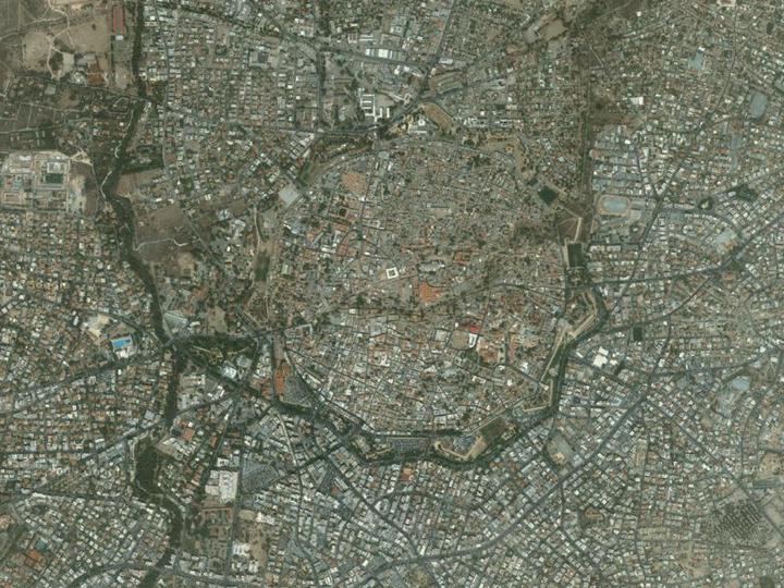 Die Stadt ist sowohl Hauptstadt der Republik Zyperna als auch Hauptstadt der Türkischen Republik Nordzypern. Der dunkle Streifen durch die Altsatdt, ist die UN-Pufferzone.