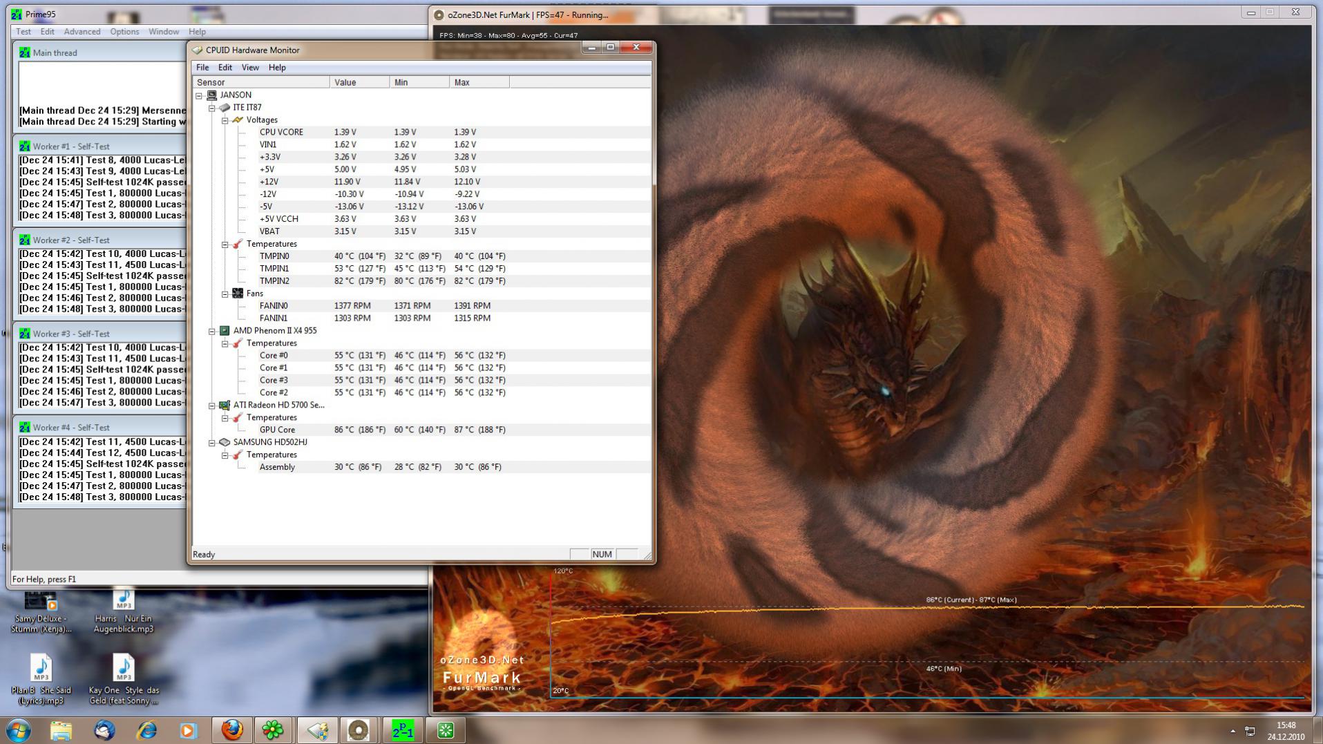 jetz wollt ich euch ma n screenie zeigen über temps und volts und fragen ob da alles ok is damit ich sowas schonma ausschließen kann (volllast mit prime95 und furmark gleichzeitig, graka lüfter auf 100% gestellt)