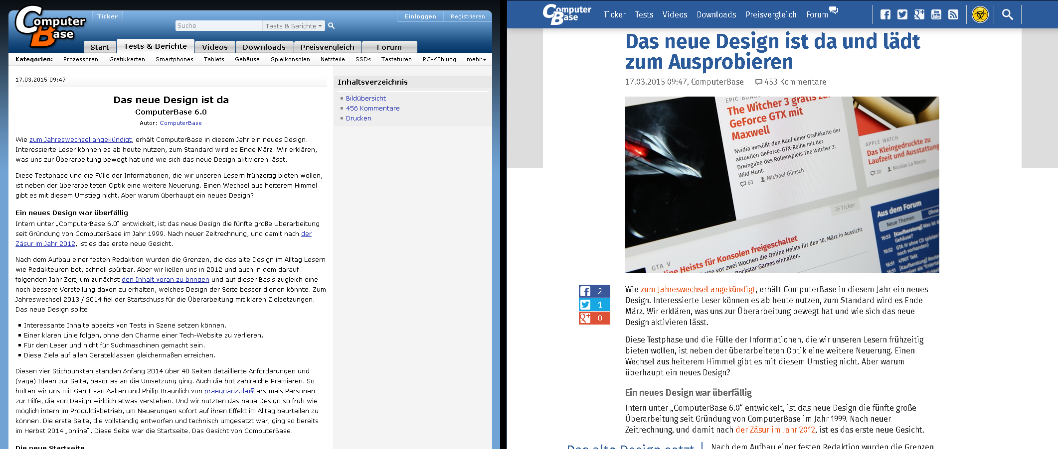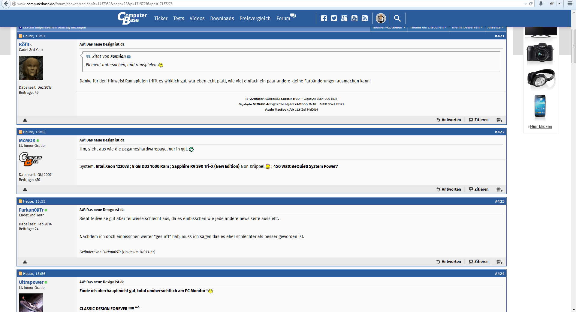 Grundsätzlich ist es ja richtig nicht stehen zu bleiben und sich weiterzuentwickeln. Die Kopfleiste, die immer sichtbar bleibt, gefällt mir z.B. sehr gut. Auch die Entwicklung zur besseren Darstellung auf mobilen Geräten ist mehr als verständlich. Auf mobilen Geräte ist das neue Design auch ganz gut zu lesen. Das betrifft vor allem die Artikel. Die großen Bilder auf der Startseite nehmen aber (zu) viel Platz für Information weg und man muss erstmal scrollen. Die Werbung auf dem Telefon ist mir auch aufgefallen, mag ich nicht, da das alles Daten sind, die zusätzlich geladen werden müssen. Ich nutze am PC keinen Werbeblocker etc. für CB und verstehe die Notwendigkeit von Werbung. Auf dem Telefon würde ich sie jedoch lieber nicht sehen wollen, meinetwegen mit einer ähnlichen Regelung wie früher, dass zumindest einloggte Nutzer auf dem Mobilgerät keine Werbung bekommen.